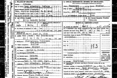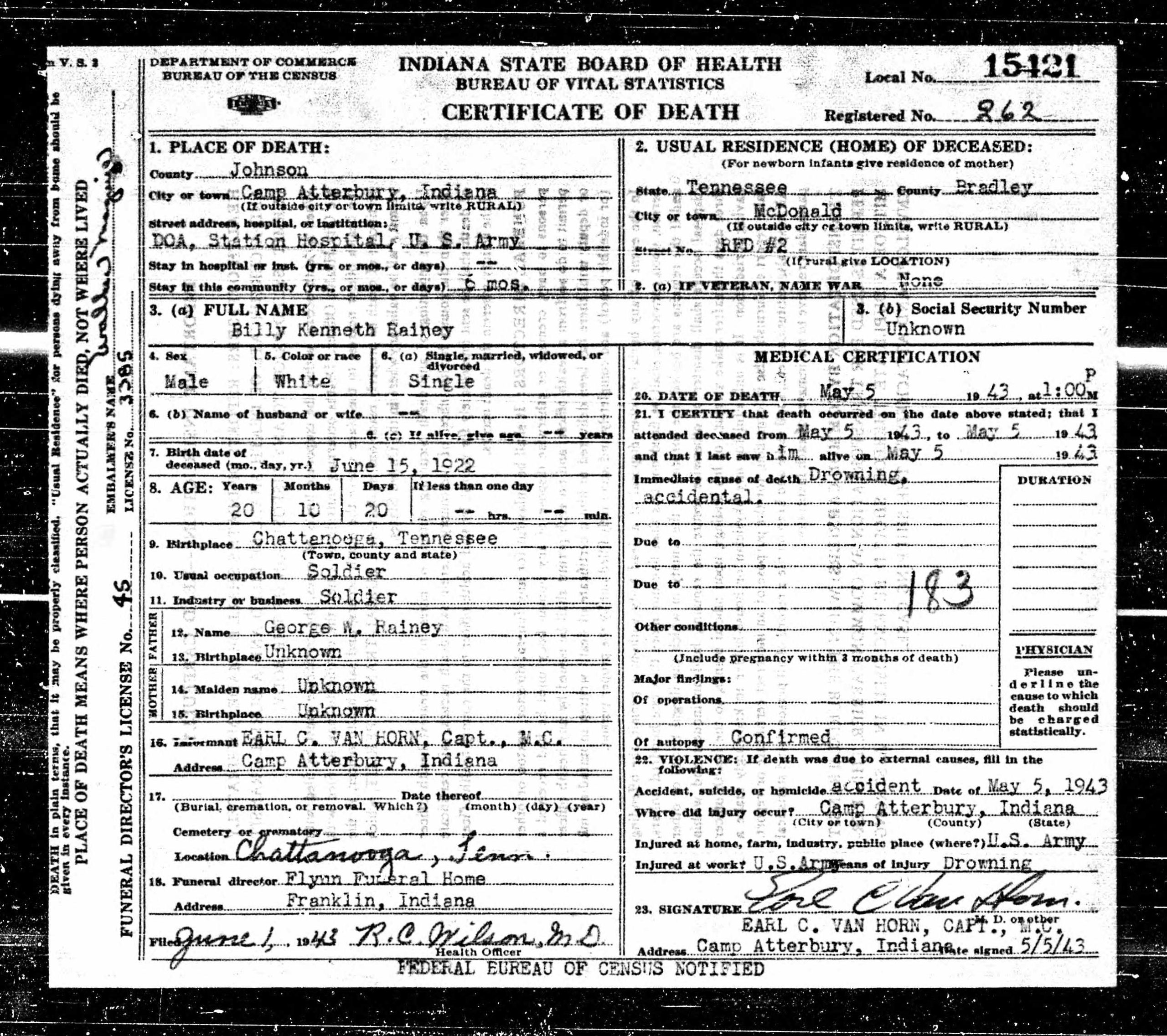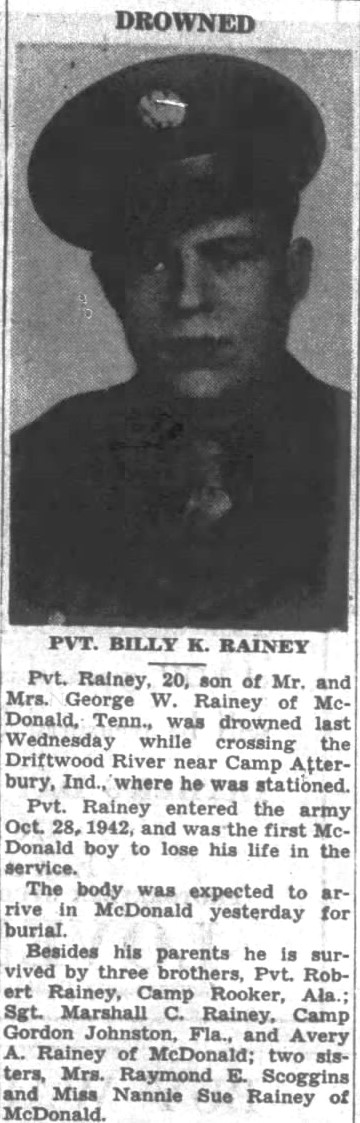 Camp Atterbury, May 6 – Pvt. Billie K. Rainey, age 20, of McDonald, Tenn., R.R. 2, was drowned Wednesday noon while swimming across Driftwood river, the public relations office announced today.
