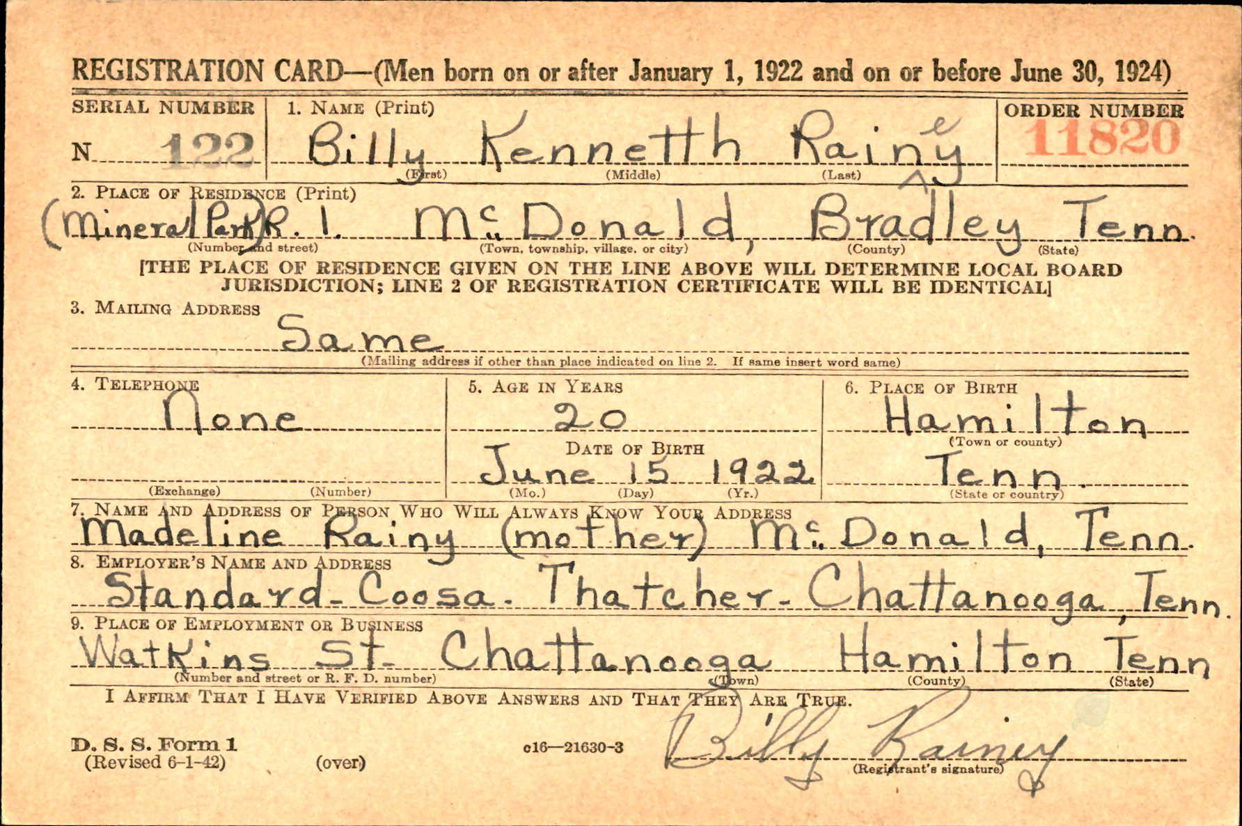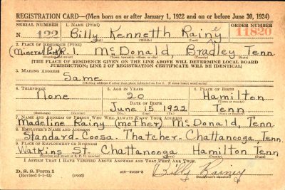 Billey Kenneth Rainey was born 15 June 1922, the son of George William Rainey and Madeline Welch.