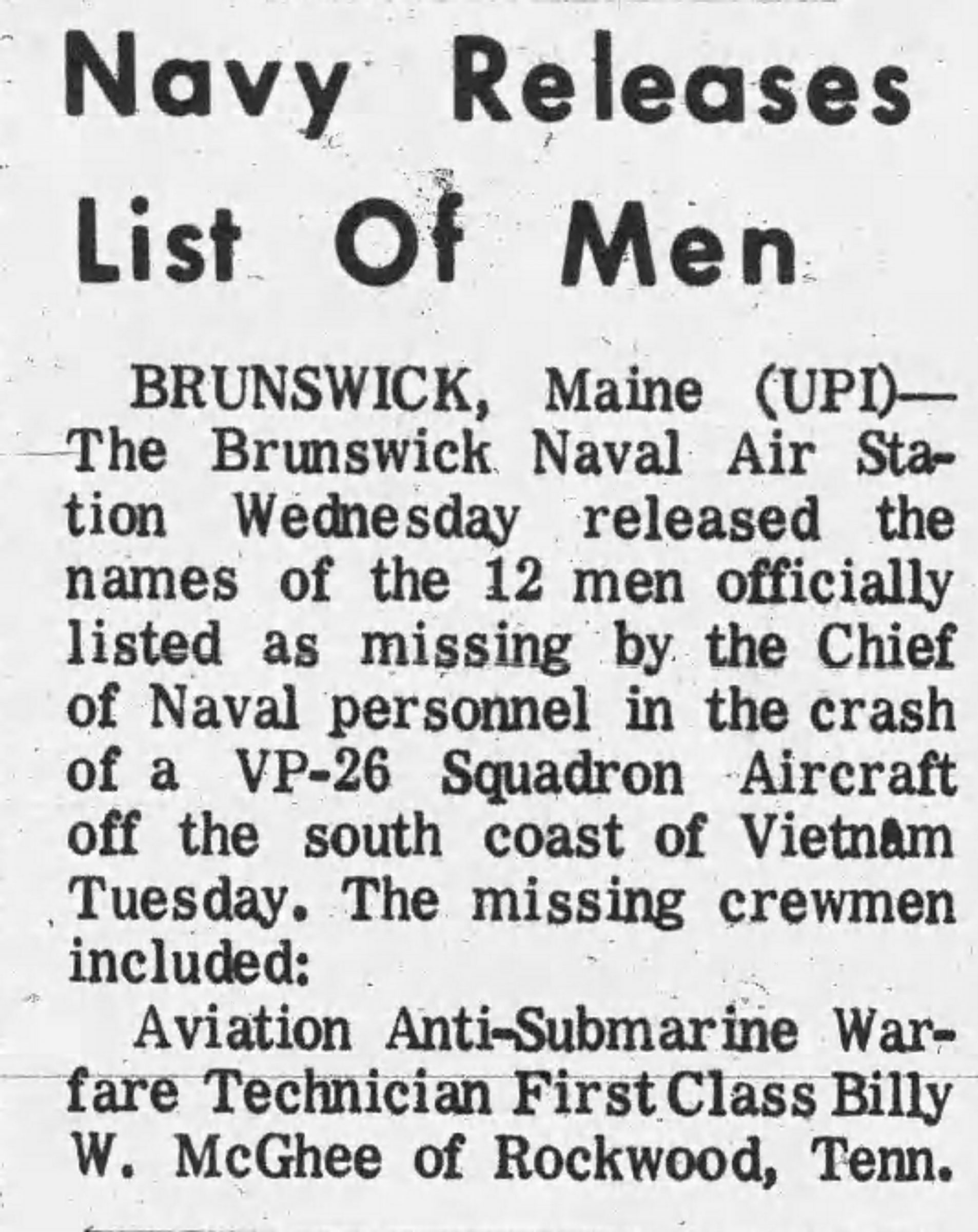 On the morning of 05 Feb 1968, a P-3B aircraft (BuNo 153440) of Patrol Squadron 26 departed U-Tapao Air Base in Thailand for a 24-hour “Market Time” patrol over the Gulf of Thailand and the South Vietnamese coastline. The aircraft was manned by VP-26’s Crew Eight, normally based at NAS Brunswick, Maine, but on TDY to Southeast Asia. Shortly after midnight on the night of 5/6 Feb 68 the crew reported the first of a number of small surface contacts. Nothing was heard from Crew Eight after a final radio contact at 0300 06 Feb, and SAR efforts were begun after daybreak. Floating wreckage was located in the Gulf of Thailand about 65 miles southwest of Rach Gia, SVN. Salvage efforts began on 11 February and located the aircraft wreckage in about 100 feet of water, but divers were able to recover the bodies of only two of the twelve men aboard. Billy W. McGhee was one of the men whose bodies were recovered.