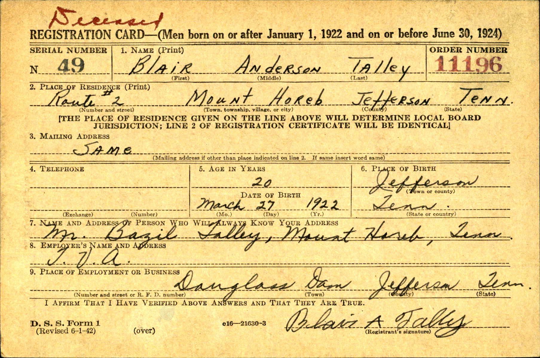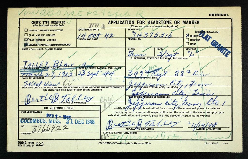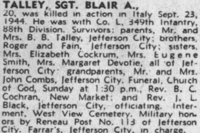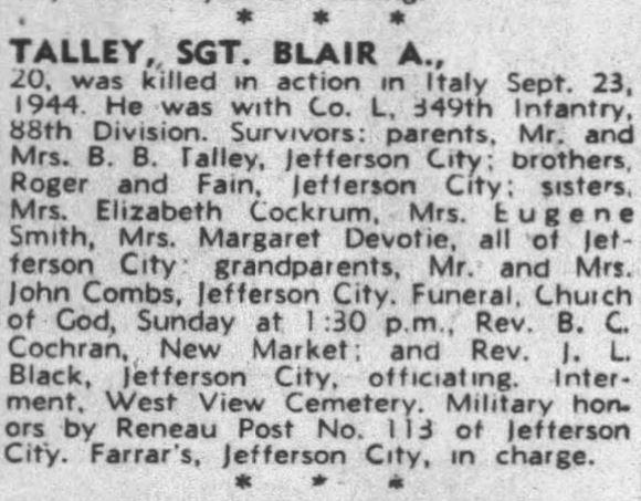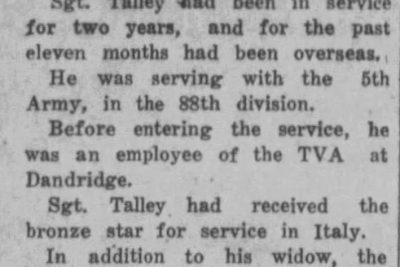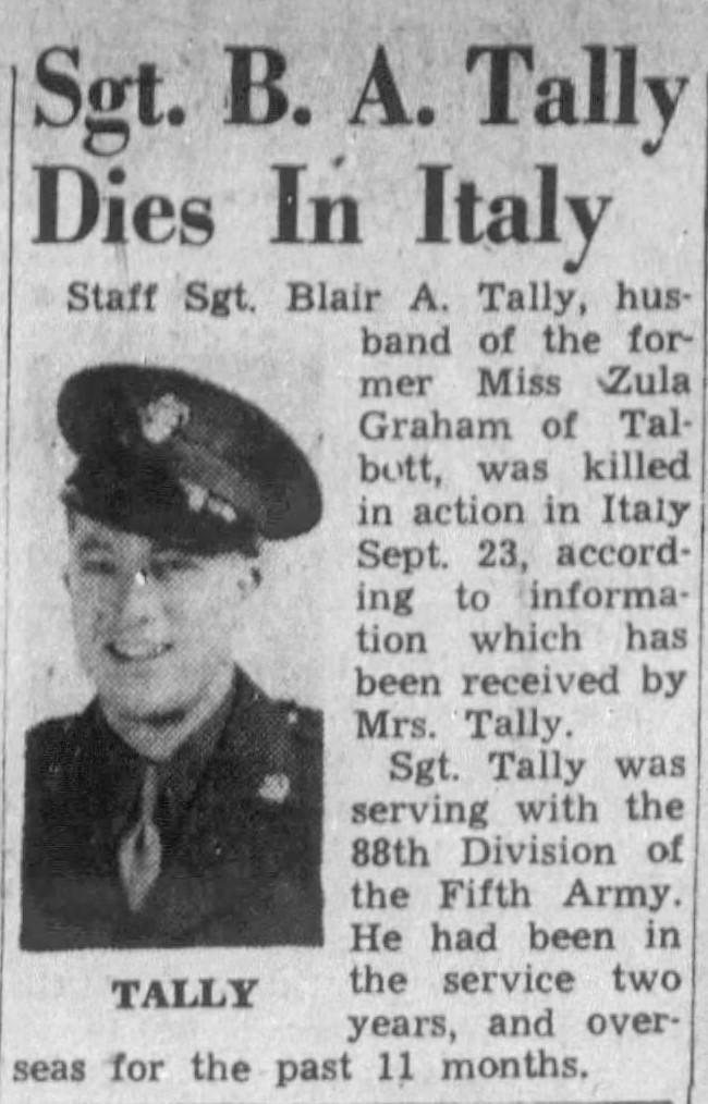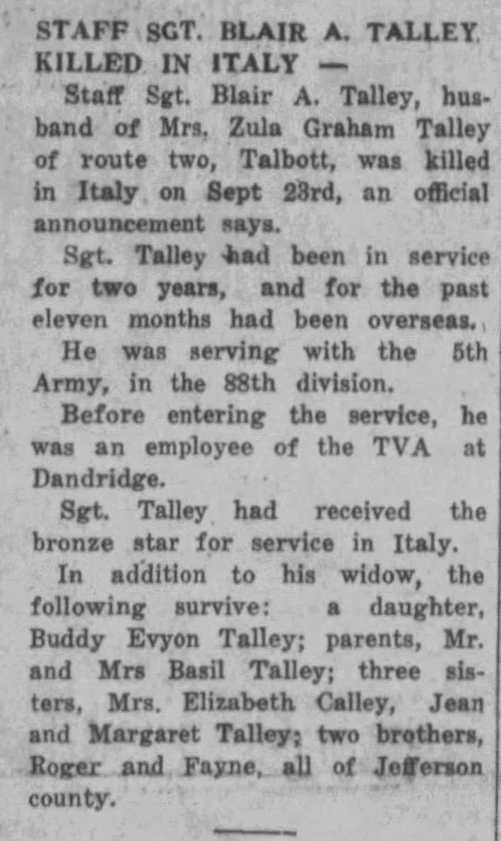 Staff Sgt. Blair A. Talley, husband of Zula Graham Talley of route two, Talbott, was killed in Italy on Sept. 23rd, an official announcement says. Sgt. Talley had been in service for two years, and for the past eleven months had been overseas. He was serving with the 5th Army, in the 88th Division. Before entering the service, he was an employee of the TVA at Dandridge. Sgt. Talley had received the bronze star for service in Italy. In addition to his widow, the following survive: a daughter, Buddy Evyon Talley; parents, Mr. and Mrs. Basil Talley; three sisters, Mrs. Elizabeth Calley, Jean and Margaret Talley; two brothers, Roger and Fayne, all of Jefferson county.