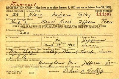 Blair Anderson Talley was born on 27 March 1922, the son of Birdie Basil Talley and Mary Combs. Husband of Zula Mae Graham