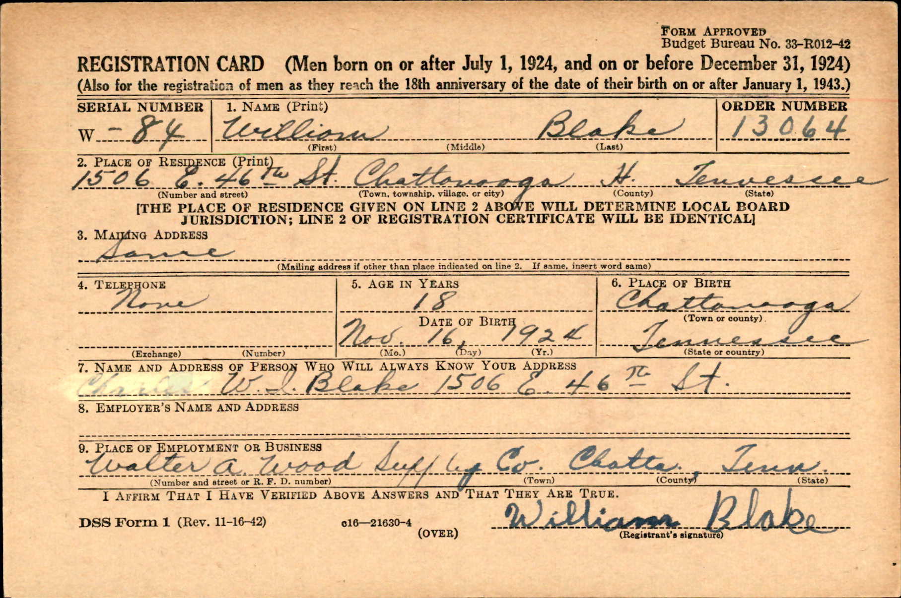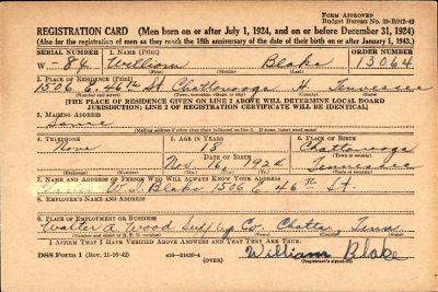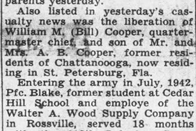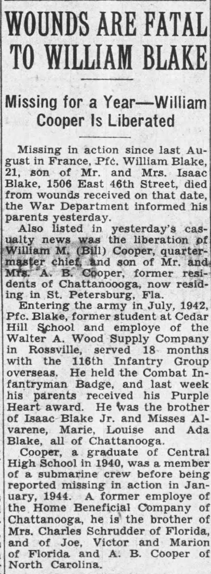 Missing in action since last August in France, Pfc. William Blake, 21, son of Mr. and Mrs. Isaac Blake, 1506 East 46th Street, died from wouds received ont hat date, the War Department informed his parents. Entering the army in July, 1942, Pfc. Blake, former student at Cedar High School and employe of the Walter A. Wood Supply Company in Rossville, served 18 months with the 116th Infantry Group overseas. He held the Combat Infantryman Badge, and last week his parents received his Purple Heart award. He was the brother of Isaac Blake Jr., and Misses Alvarene, Marie, Louise and Ada Blake, all of Chattanooga.