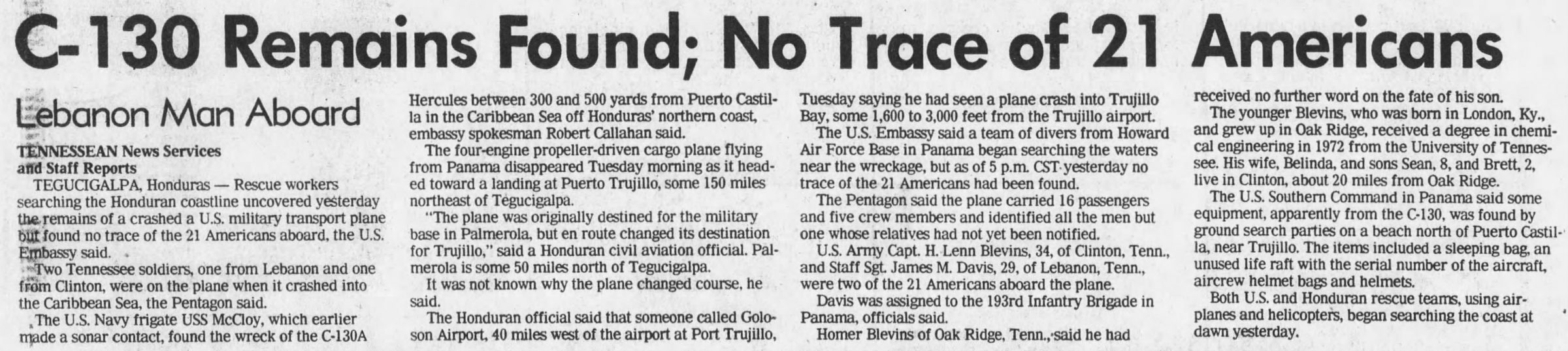 Captain Homer Lenn Blevins was born in London Laura, Kentucky, son of Homer Blevins and husband of Belinda Darleen Irwin. He was stationed in Panama and was one of twenty-one on a C-130A plane that went down during stormy weather in Caribbean waters near the Honduran coast. He was thirty-four.