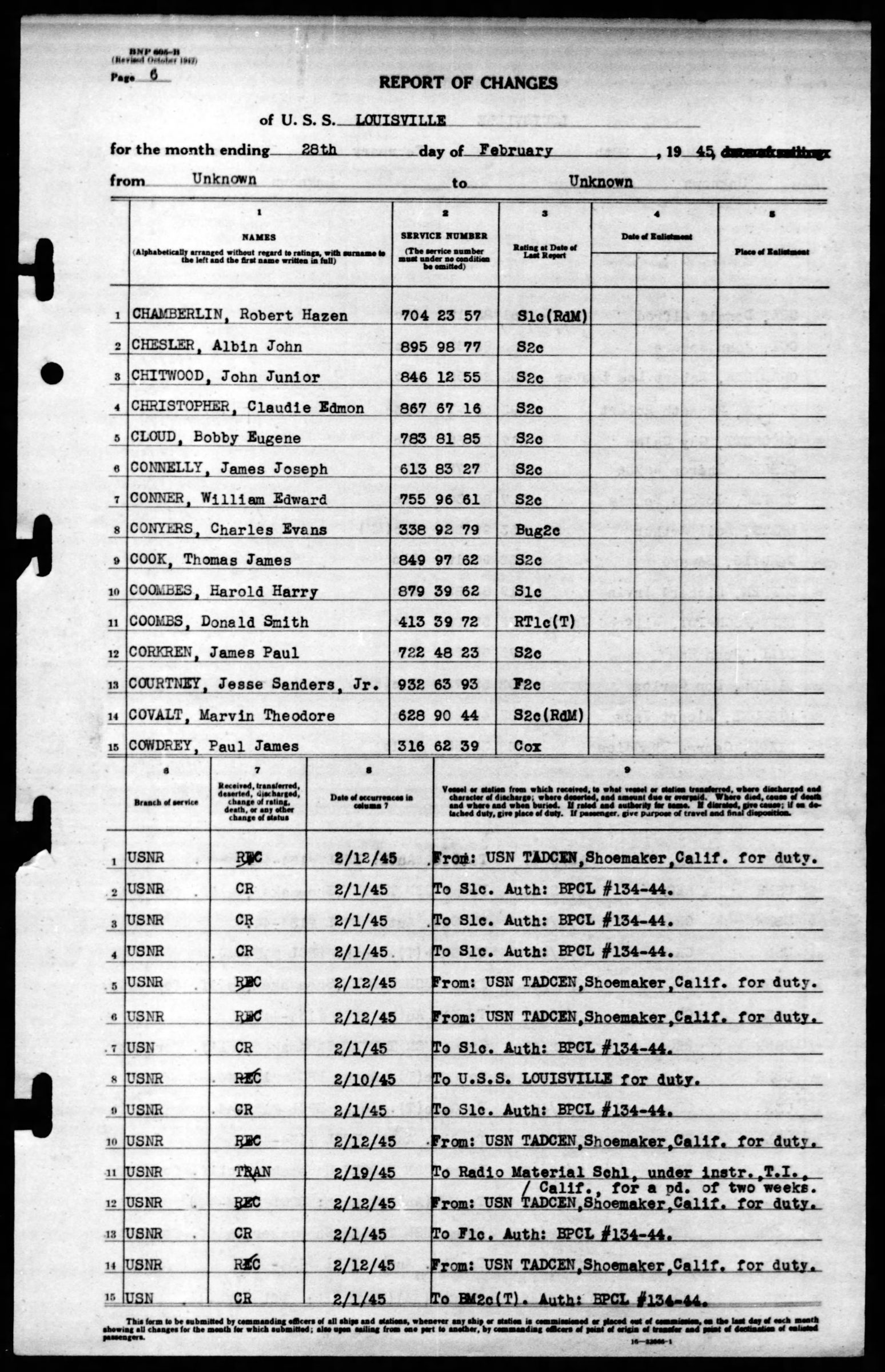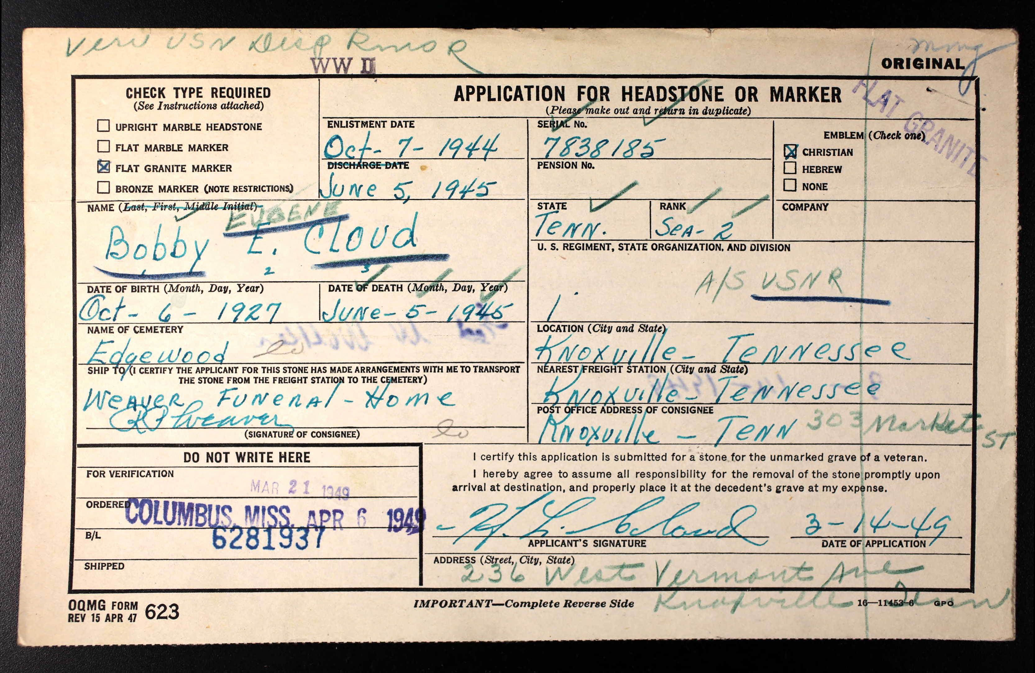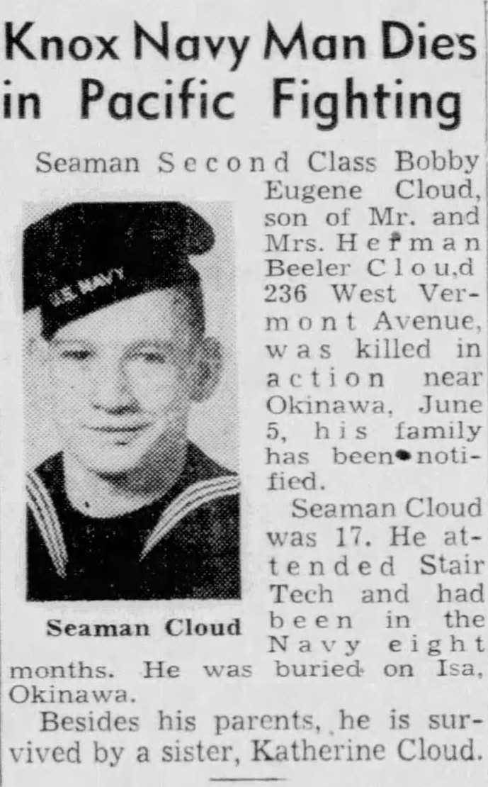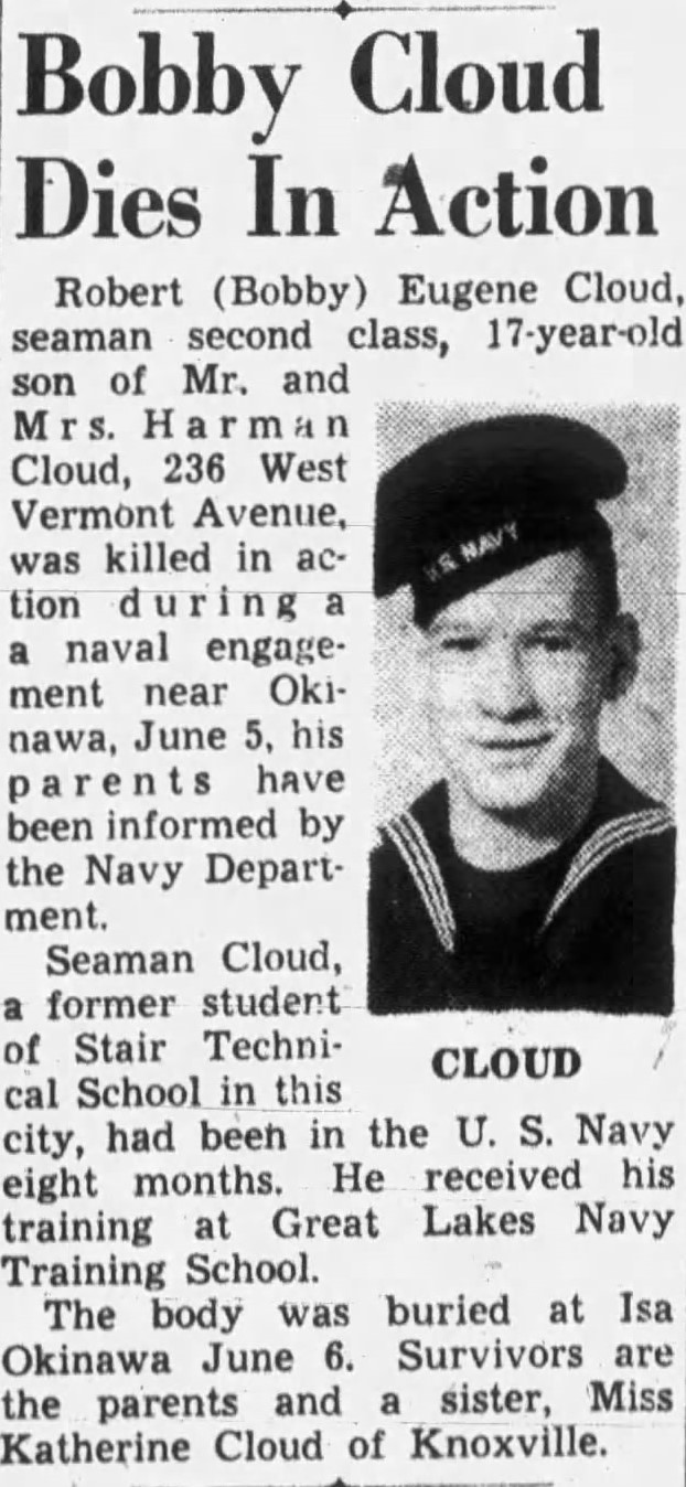 Robert (Bobby) Eugene Cloud, seaman second class, 17-year-old son of Mr. and Mrs. Harman Cloud, 236 West Vermont Avenue, was killed in action during a naval engagement near Okinawa, June 5, his parents have been informed by the Navy Department. Seaman Cloud, a former student of Stair Technical School in the city, had been in the U.S. Navy eight months. He received his training at Great Lake Navy Training School. The body was buried at Isa Okinawa June 6. Survivors are the parents and a sister, Miss Katherine Cloud of Knoxville.