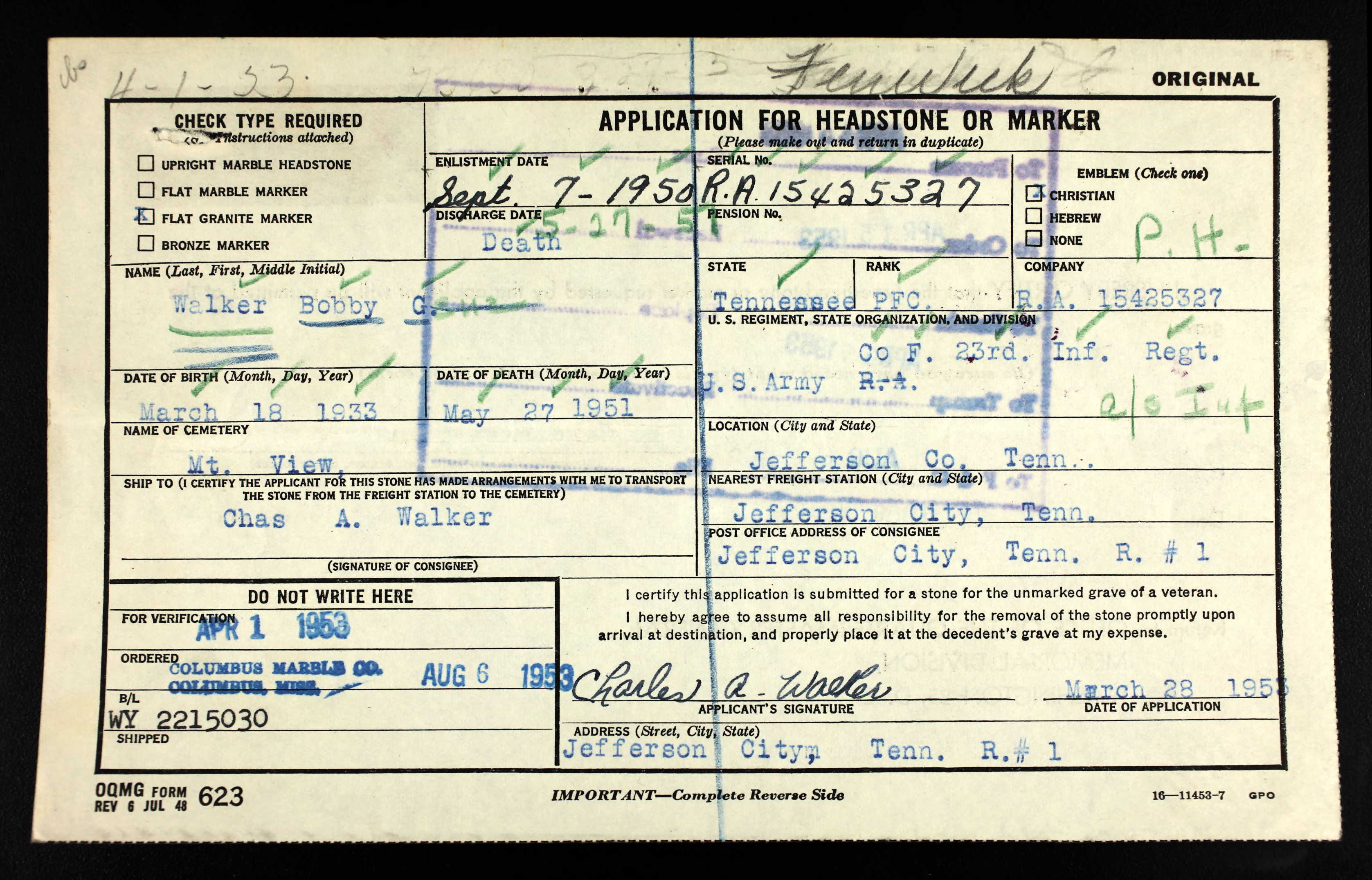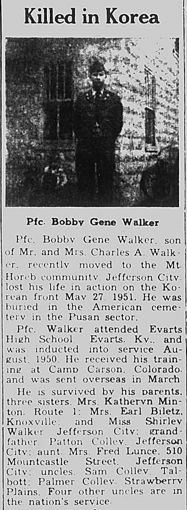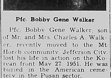 Pfc. Bobby Gene Walker, son of Mr. and Mrs. Charles A. Walker, recently moved to the Mt. Horeb community Jefferson City, lost his life in action on the Korean front May 27, 1951. He was buried in the American Ccemetery in the Pusan sector.