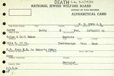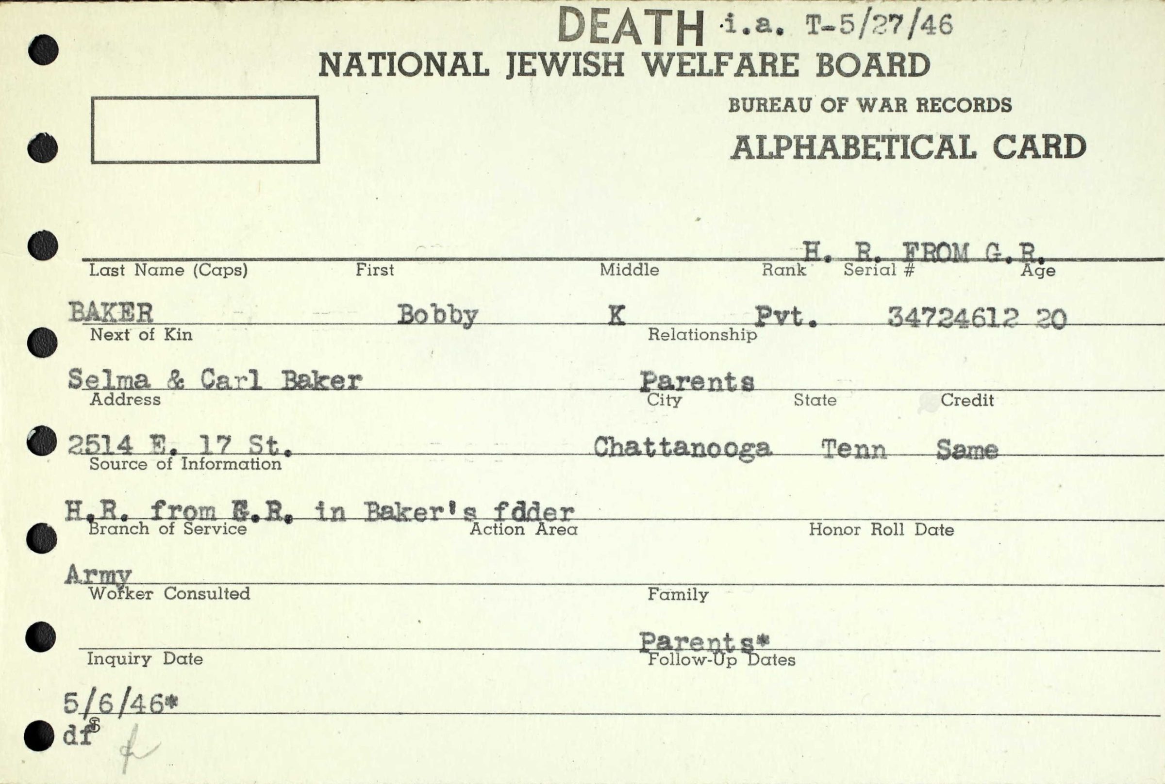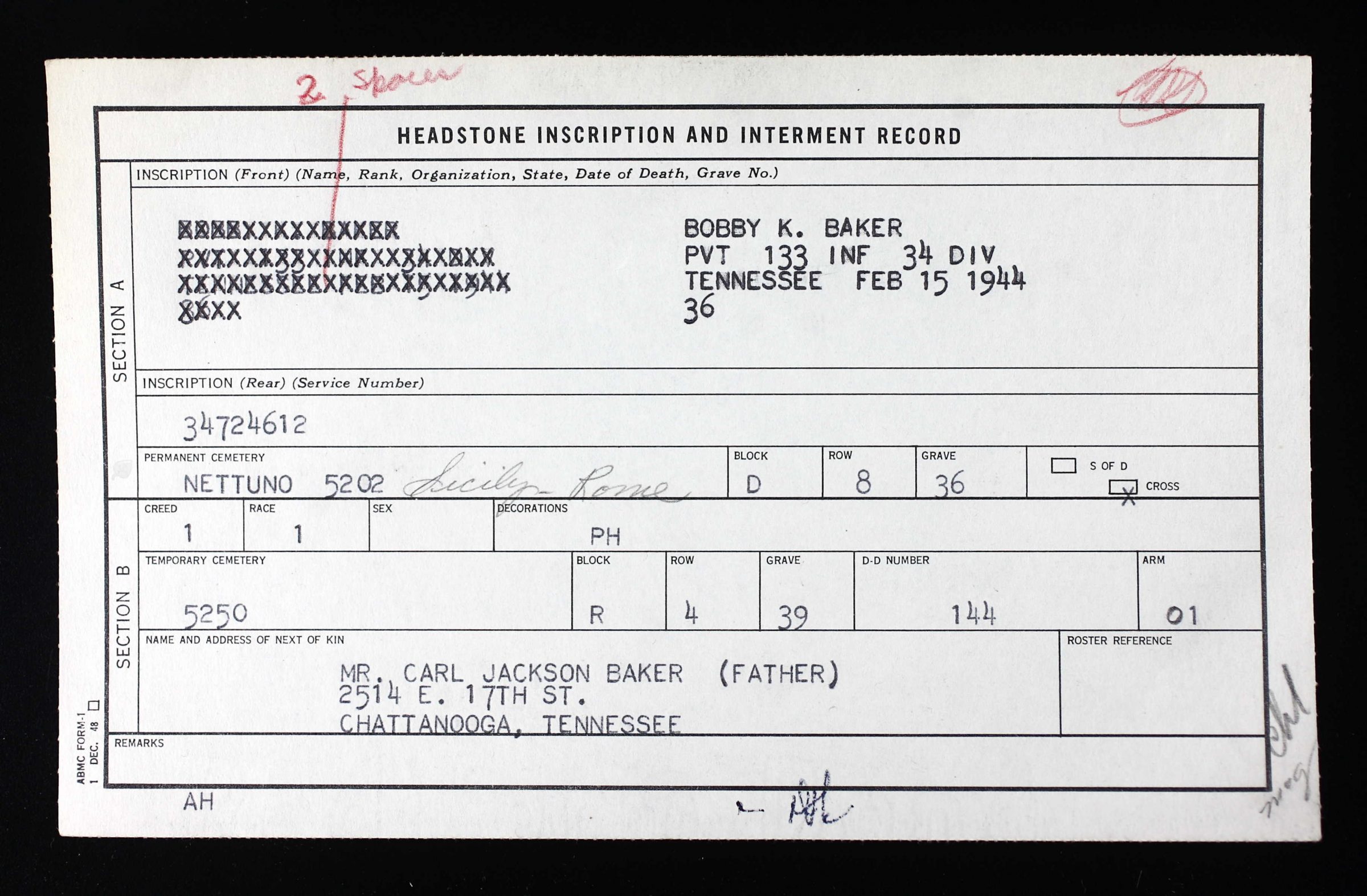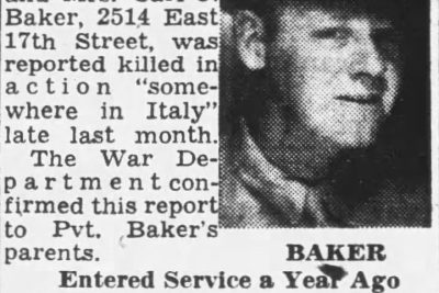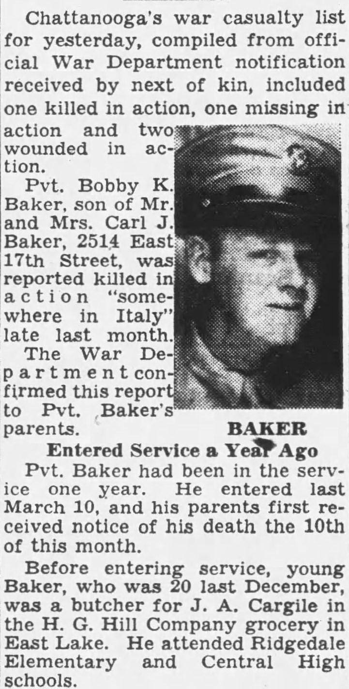 Pvt. Bobby K. Baker, son of Mr. and Mrs. Carl J. Baker, 2514 East 17th Street, was reported killed in action “somewhere in Italy” late last month. The War Department confirmed this report to Pvt. Baker’s parents. Pvt. Baker had been in the service one year. He entered last March 10, and his parents first received notice of his death the 10th of this month. Before entering service, young Baker, who was 20 last December, was a butcher for J.A. Cargile in the H.G. Hill Company grocery in East Lake. He attended Ridgedale Elementary and Central High Schools.