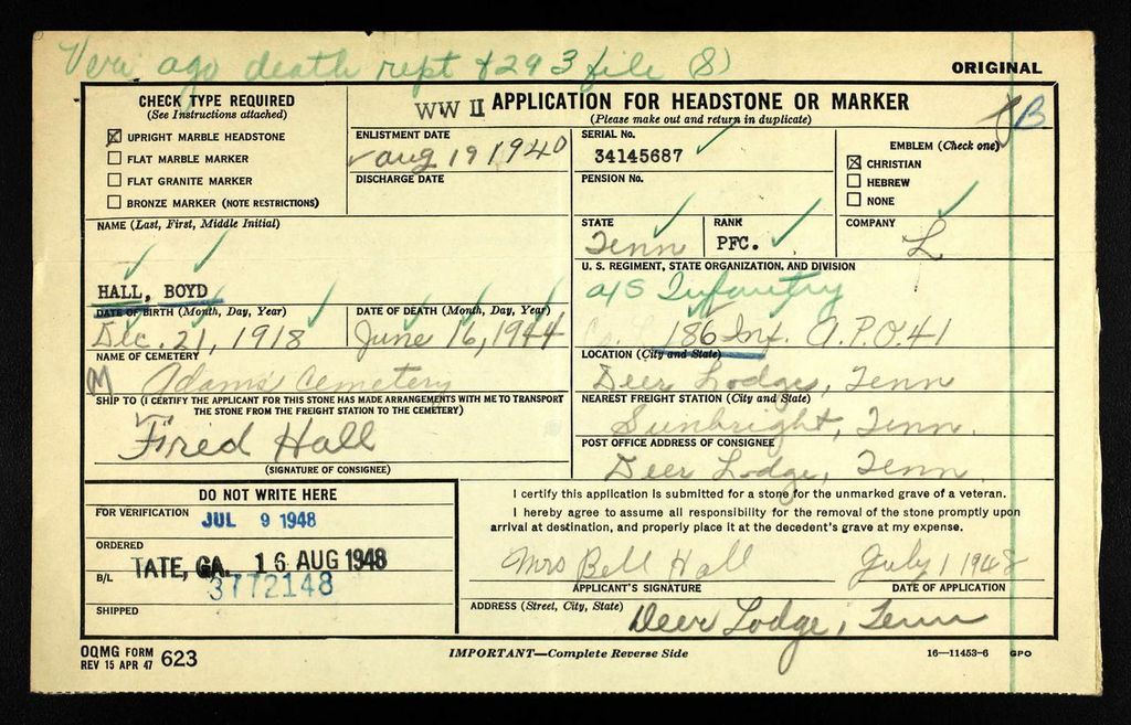 - Burial/Memorial Location: Adams Cemetery, Deer Lodge, TN