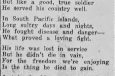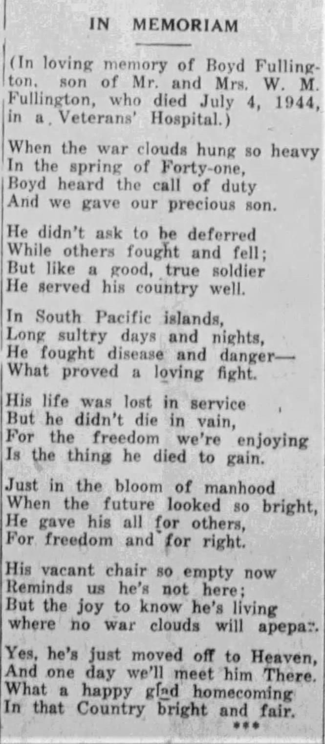 He served in the South Pacific. He died on 4 July 1944 at at Veterans Hospital at Proviso Twp, Cook County, Illinois