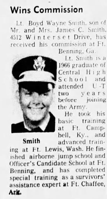 “Wayne – I never knew his first name was Boyd until he died – was my OCS classmate and later roommate when we were both somehow assigned to Fort Sill instead of helicopter training as we thought we were to be. He was the typical Southern boy and I the kid from Maine – an unusual encounter made possible by military service. His burst-through-the-door presence, his laugh, his ‘You have to be sh-tting me’ attitude, made everyone around shake their head and chuckle. He came from a great family who shared their home and heart with me when I visited before we both left for RVN – the last time I saw Wayne. He was lost in Cambodia, a mission we never had. I can’t hear of Knoxville or see a Tennessee sports team on TV that I do not think of him and his family. Know that we remember Wayne and we are thankful for the good times and the friendship you provided in the brief time we knew you. God bless Mr. and Mrs. Smith who suffered the greatest loss possible. ” -Bob Hodges