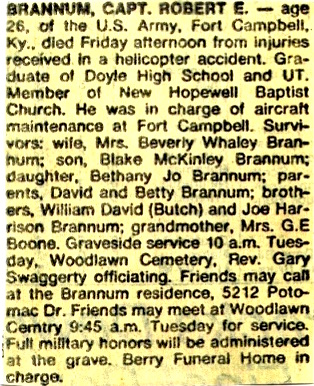 Robert Earl Brannum died in a Black Hawk helicopter crash at Ft. Campbell, Kentucky.