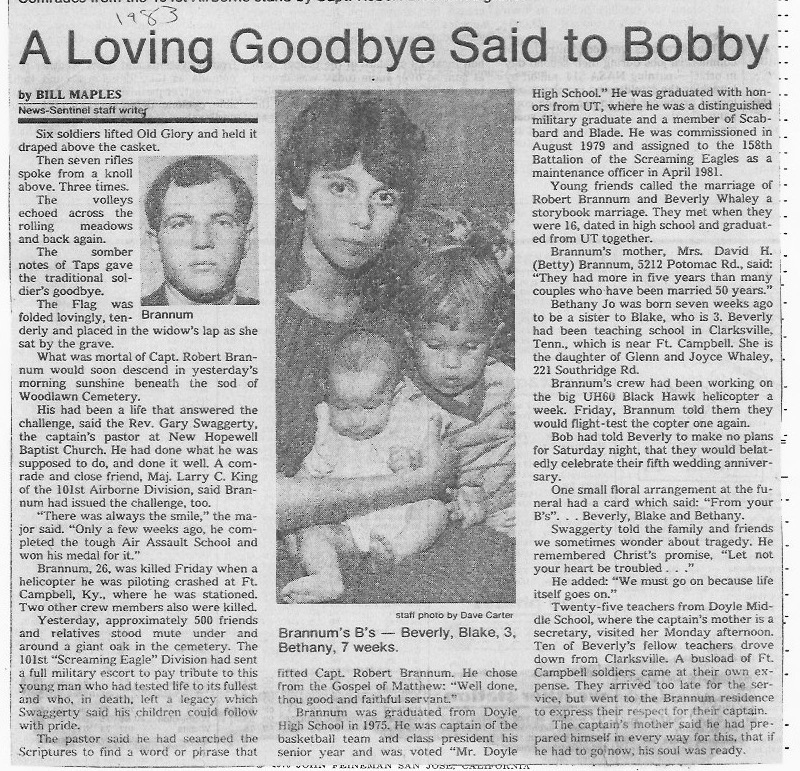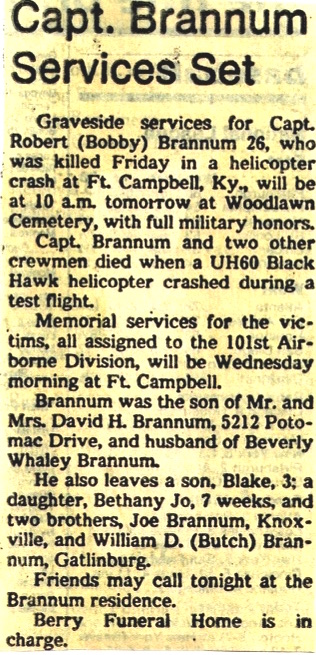 CPT Brannum was killed during a test flight when the UH-60A, #993, he was flying crashed near Christian County, Kentucky on 26 August 1983.”