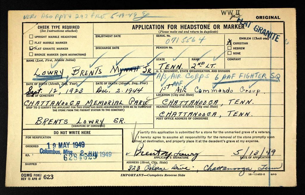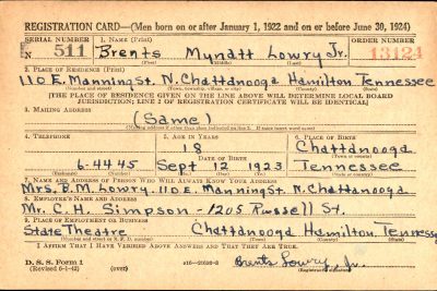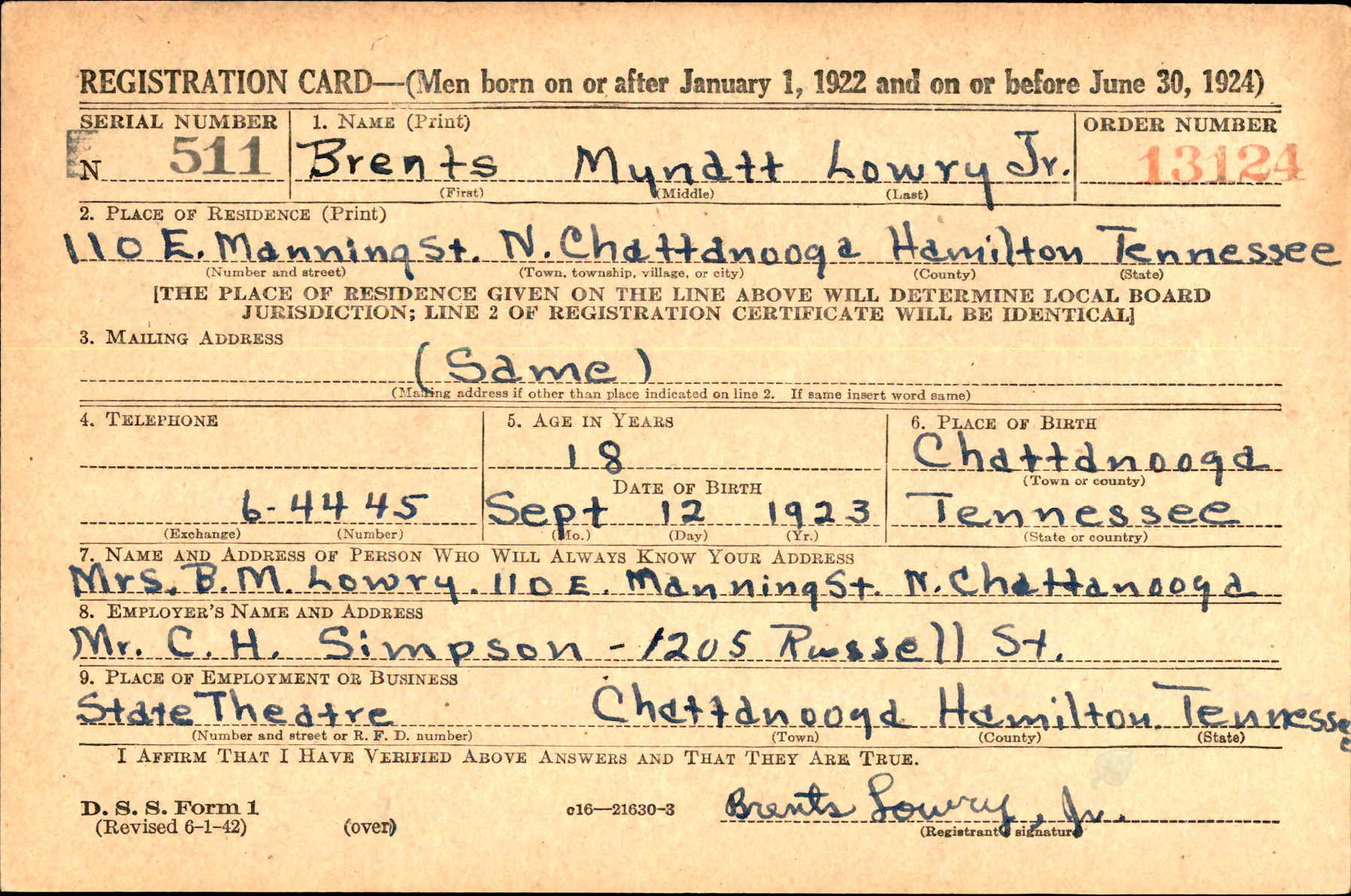 Brents Mynatt Lowry Jr. was born on 12 September 1923, the son of Brents Mynatt Lowry Sr. and Myrtle Patella Newell. He attended Chattanooga High School in 1942