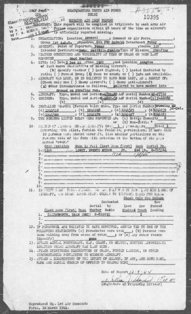 2nd Lt Lowry was the Pilot of Aircraft P-47D with serial number 42-27710. He departed from Fenny on a Strafing mission to Heho, Meiktela, Kunlon.