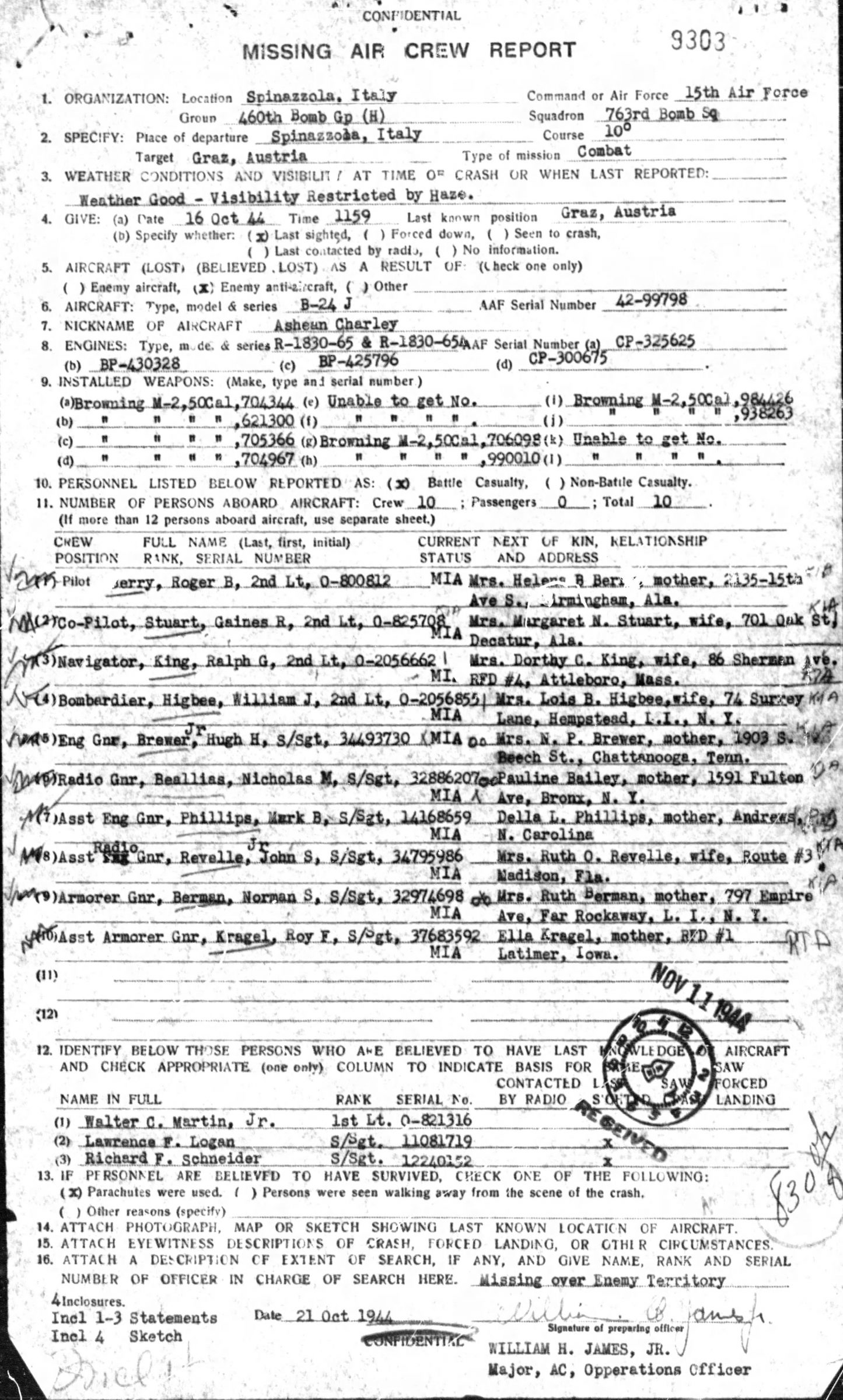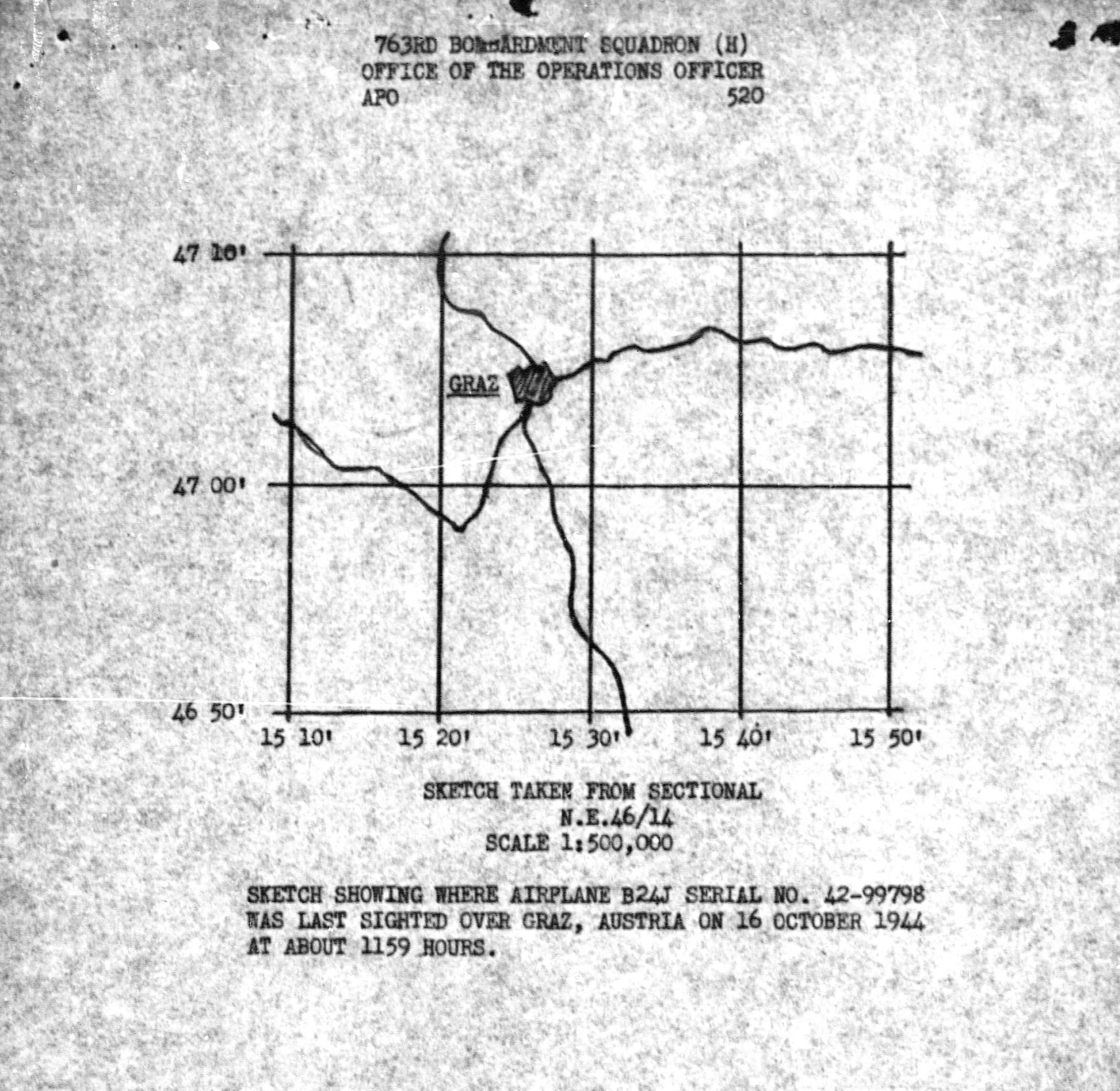The aircraft departed from Spinazzola, Italy on a combat mission to St. Valentine, Graz, Austria. Over the target the flak was intense and accurate. Just after the bombs were away, the plane suffered a direct hit and exploded. S/Sgt Brewer was in the top turret at that time.