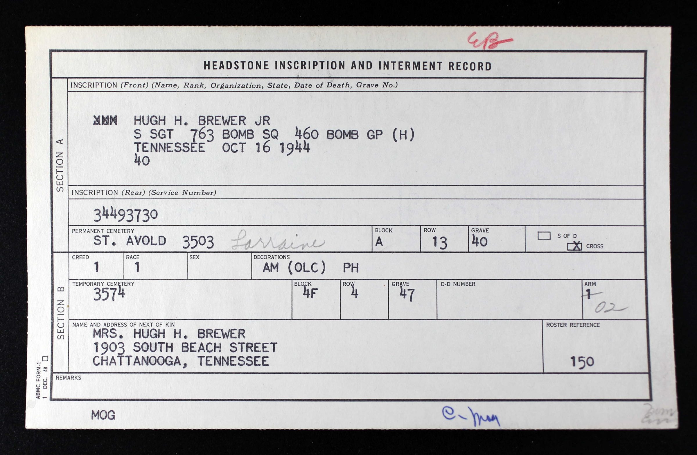 Staff Sergeant Brewer served as an Engineer/Gunner on aircraft B-24 J with serial number 42-99798. The nickname of this aircraft was Ashcan Charley.