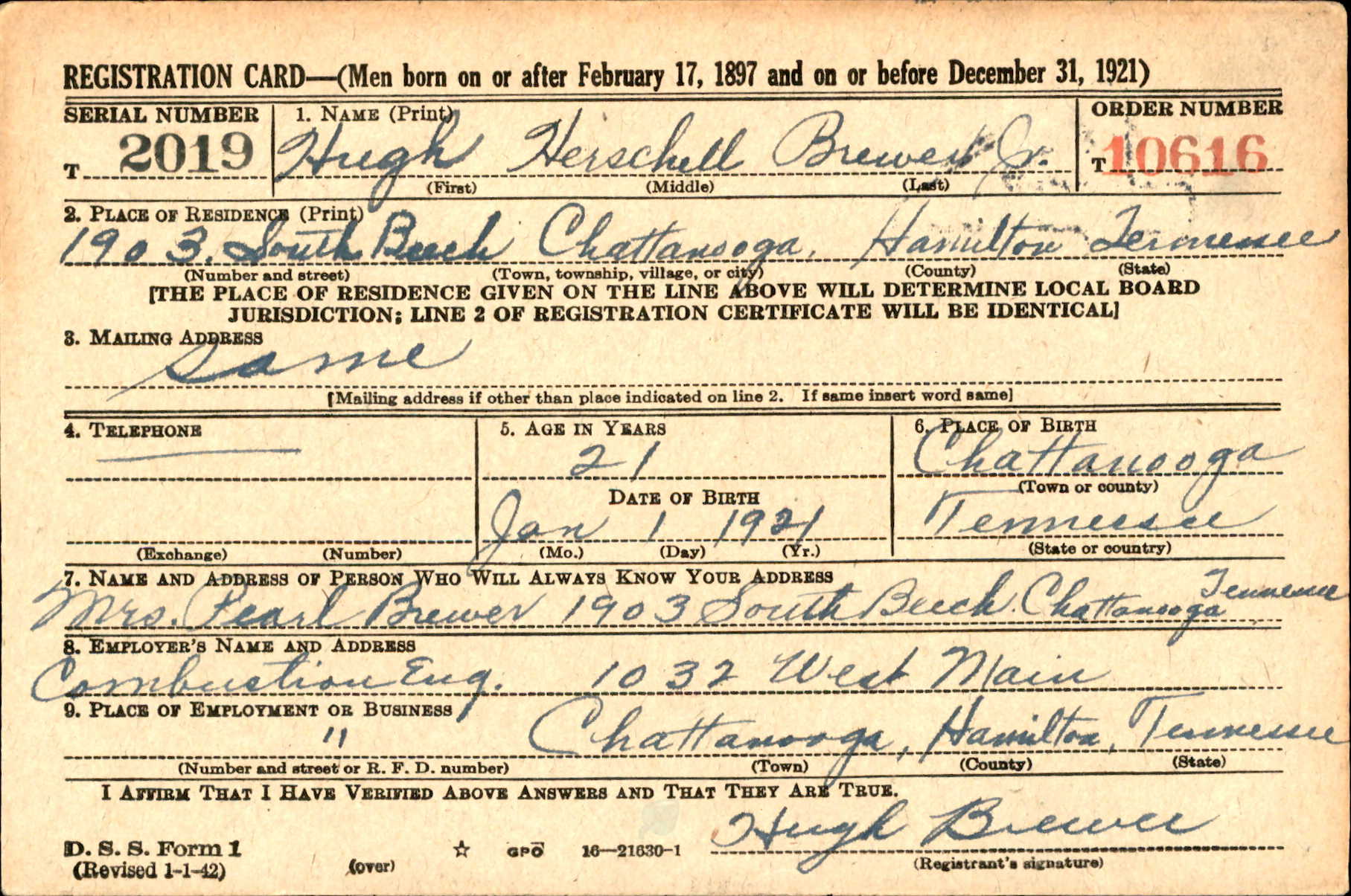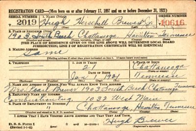 Hugh Herschell Brewer was born in Chattanooga, Tennessee, the son of Hugh Herschell Brewer and Nellie Pearl Levan.
