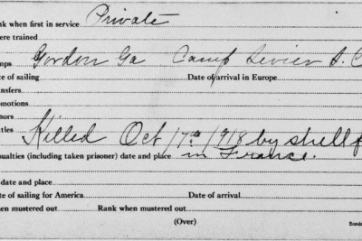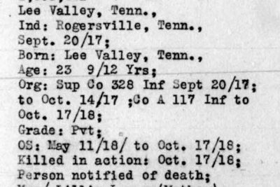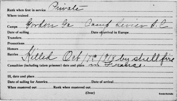 He served with Company A, 117th Infantry 30th Division and was killed by shell fire. He was initially buried at the British Military Cemetery, St-Souplet, France. He died at the age of 24.