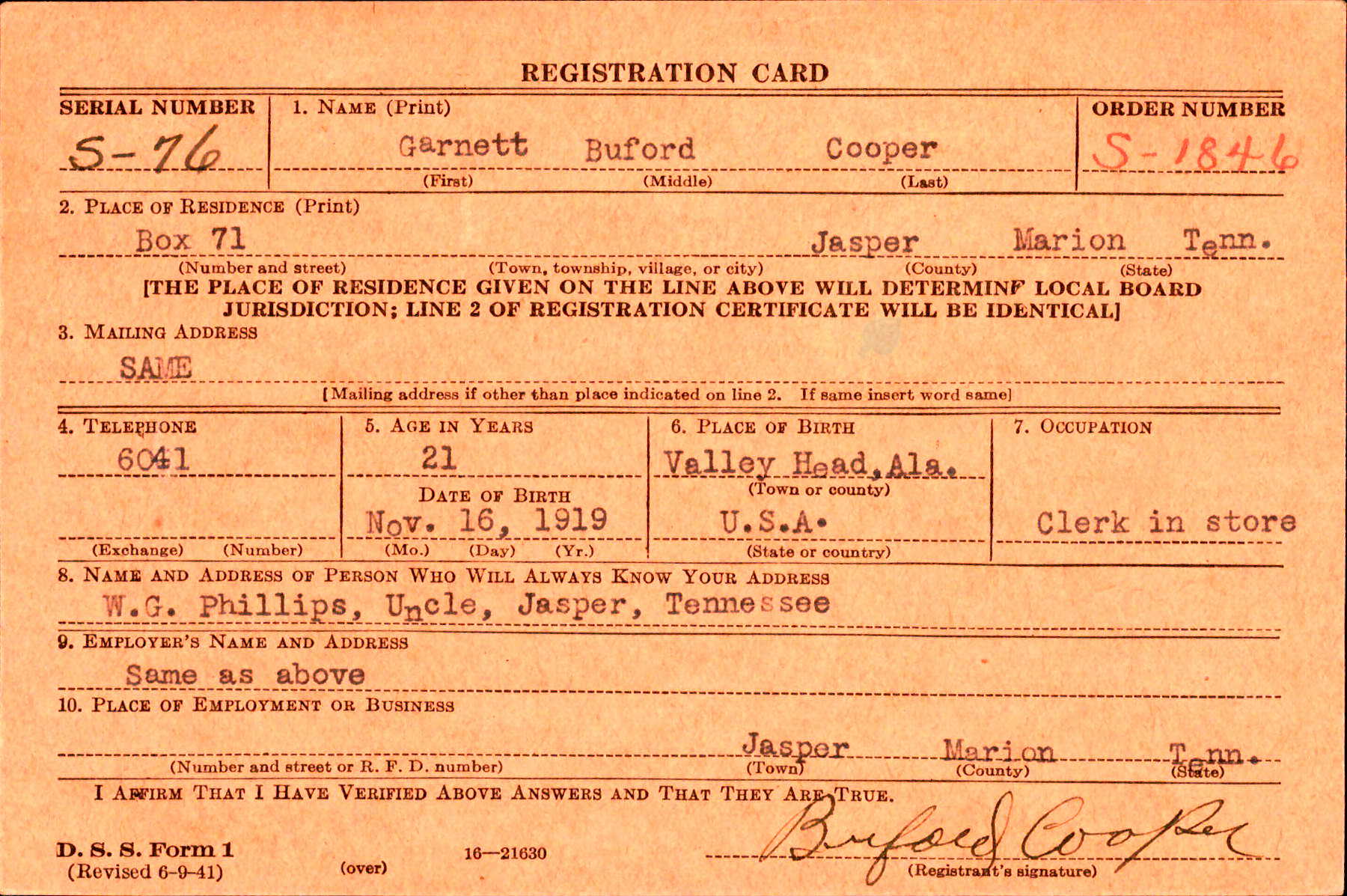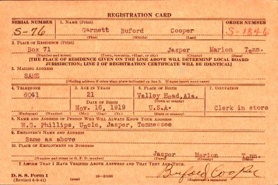 Garnett Buford Cooper was born in Alabama to Riley Herbert Cooper and Margaret Elizabeth Long. He married Lona Lee Lewis on 7 December 1941 at Dade, Georgia. Pvt Cooper entered the service on 7 December 1942, at Fort Oglethorpe in Georgia. He died in Denver, Colorado on June 25th.