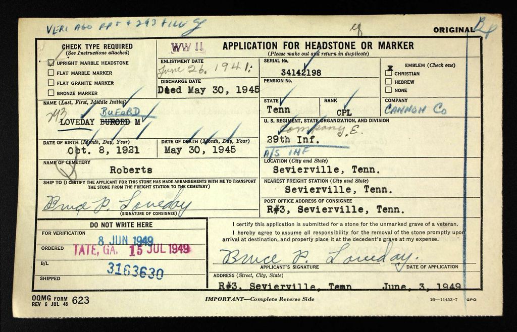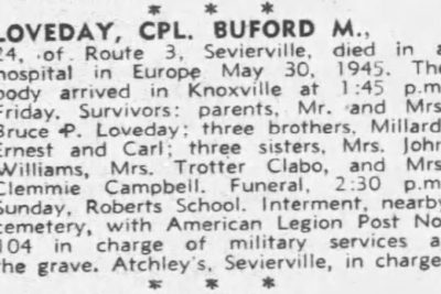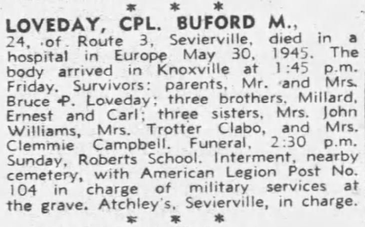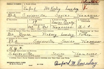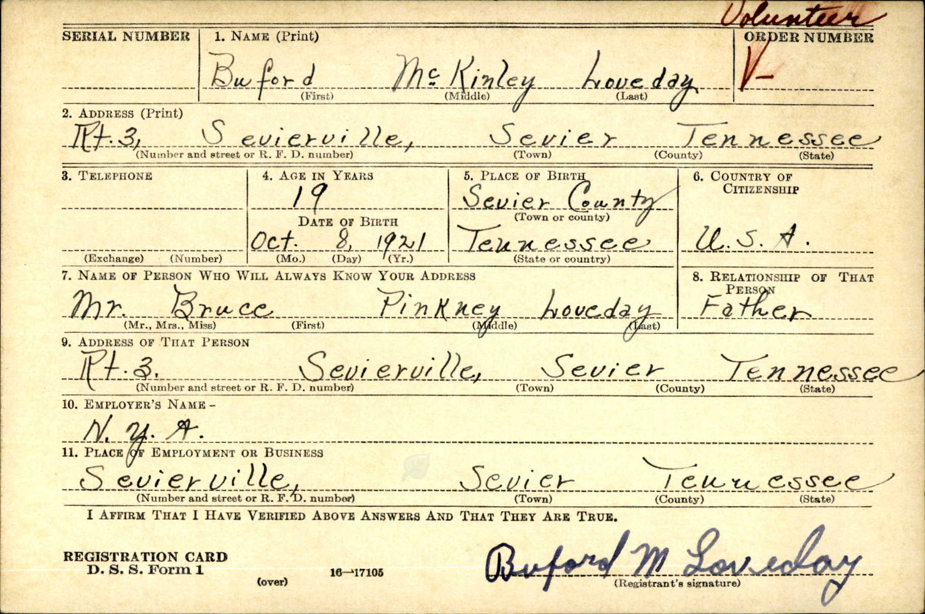 Buford McKinley Loveday was born on 8 October 1921 in Sevierville, Tennessee. He was the son of Bruce Pinkney Loveday and Sarah Sallie Eddie Sutton.