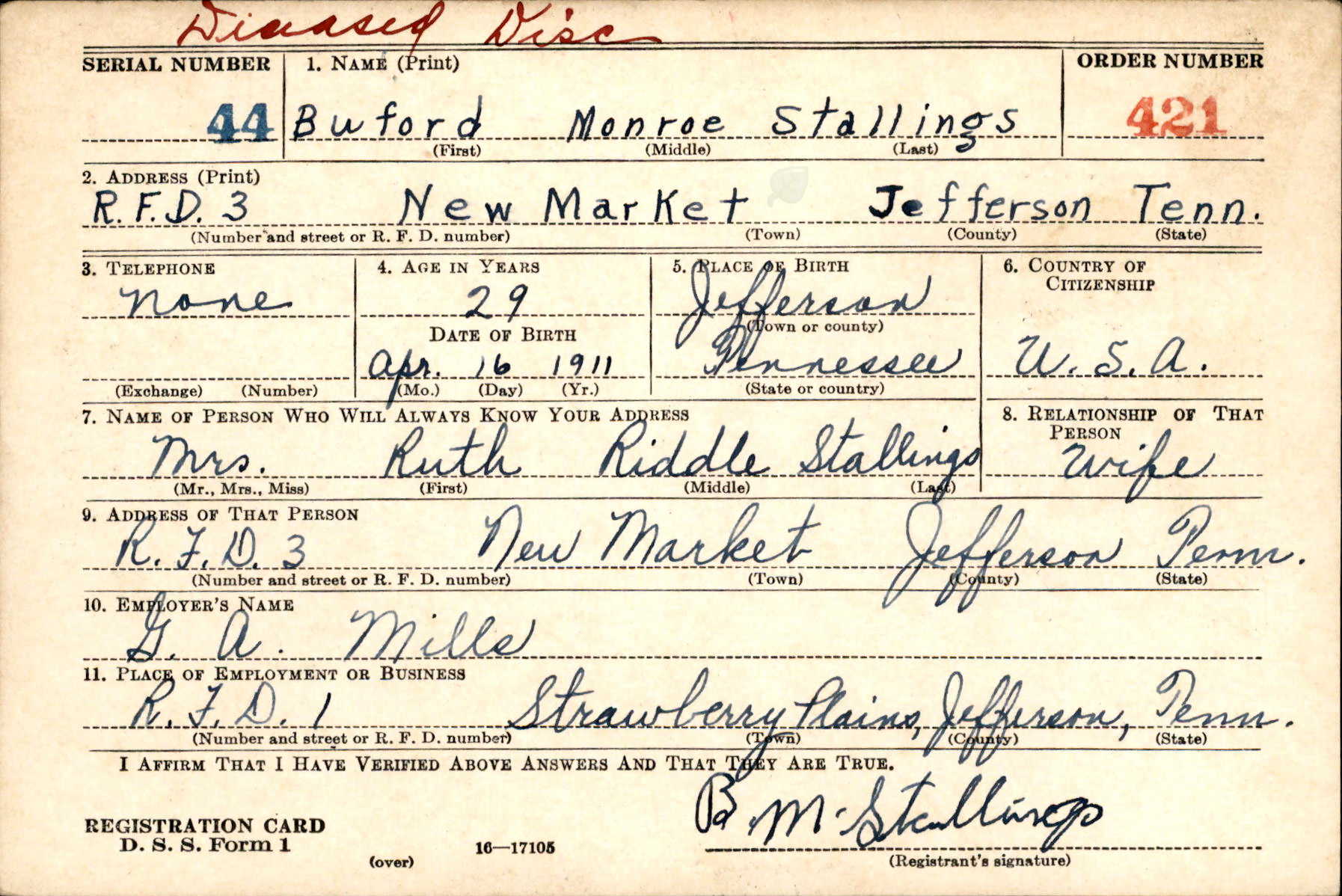 Wife: Mrs. Ruth Riddle Stallings, Rt 1 Box 302-A, Strawberry Plains, TN