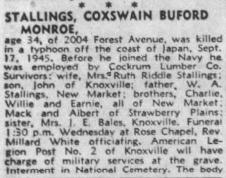 Served on the U.S.S. YMS-478. He was killed in a typhoon off the coast of Japan. He was initially buried at the USAF Cemetery-Jokohoma No. 1 in Japan. Buried at Knoxville National Cemetery, B, 5886