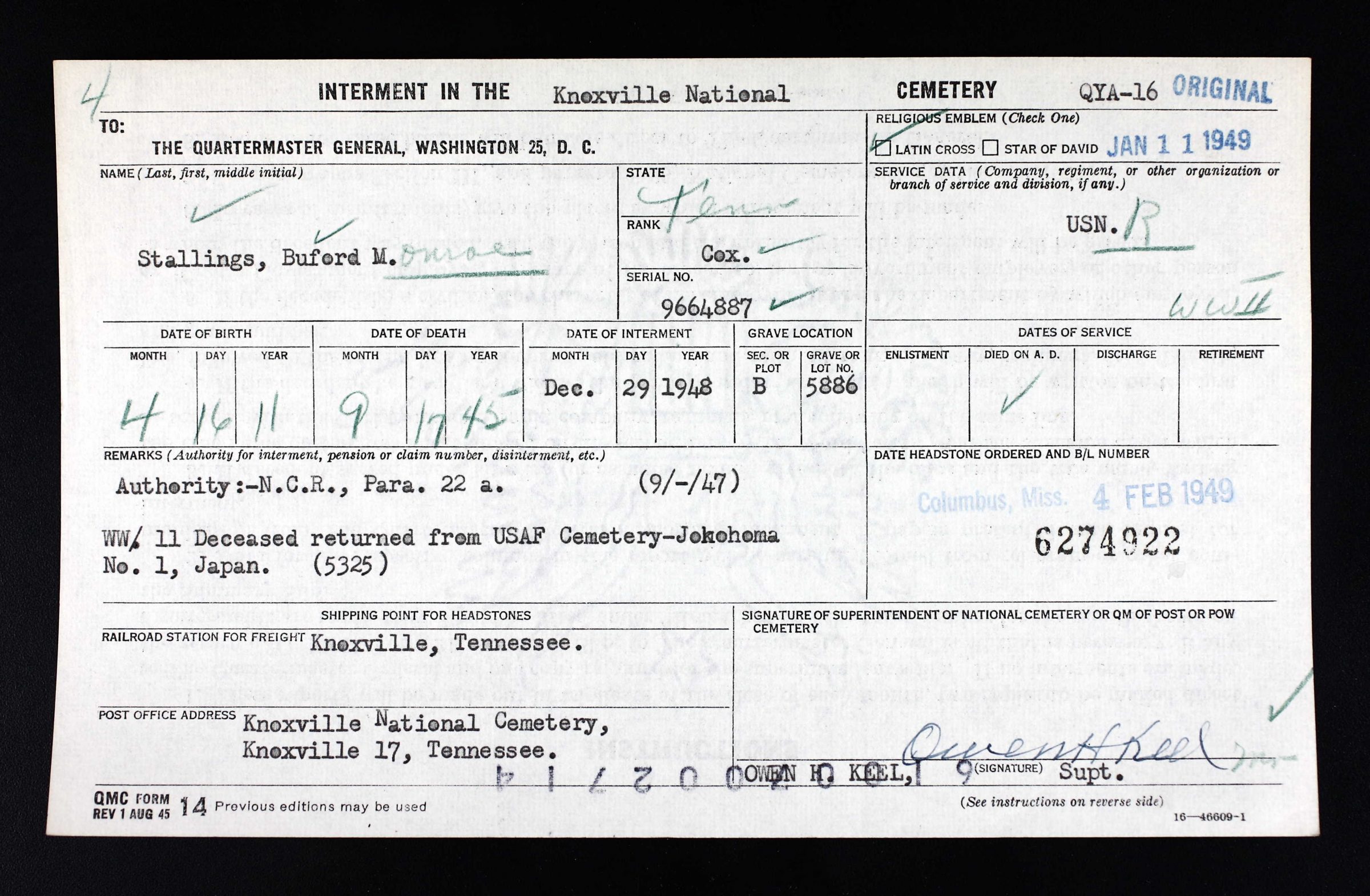 - Burial/Memorial Location: Knoxville National Cemetery, Knoxville, TN