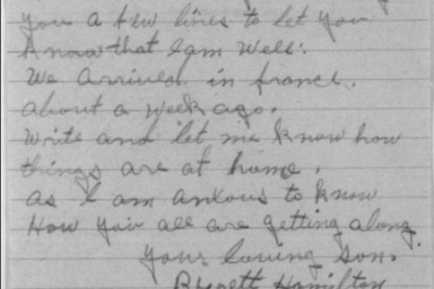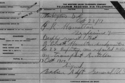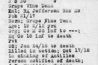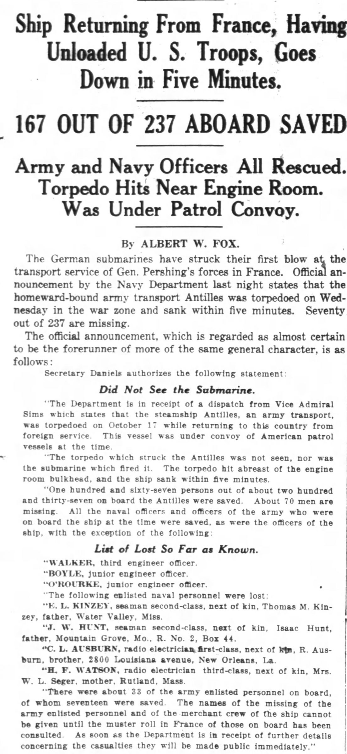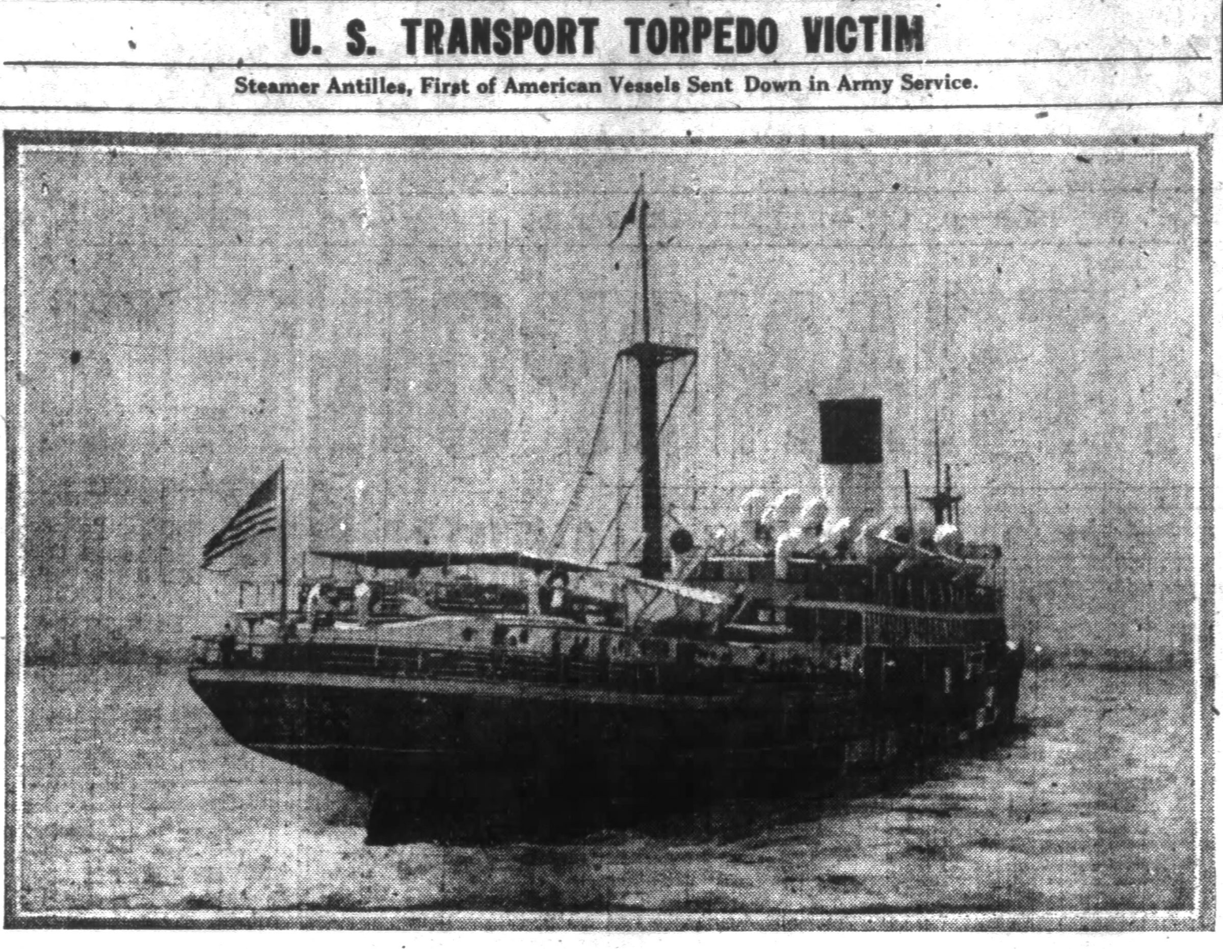 Sixty seven lives were lost when the army transport Antilles went down last Wednesday by the torpedo of a German submarine. The official list of casualties, cabled today by Gen. Pershing, shows sixty-seven lost; total survivors 170, and one unaccounted for. The dead include Private Burett Hamilton, infantry; father, J.R. Hamilton, Grapevine, Tenn.