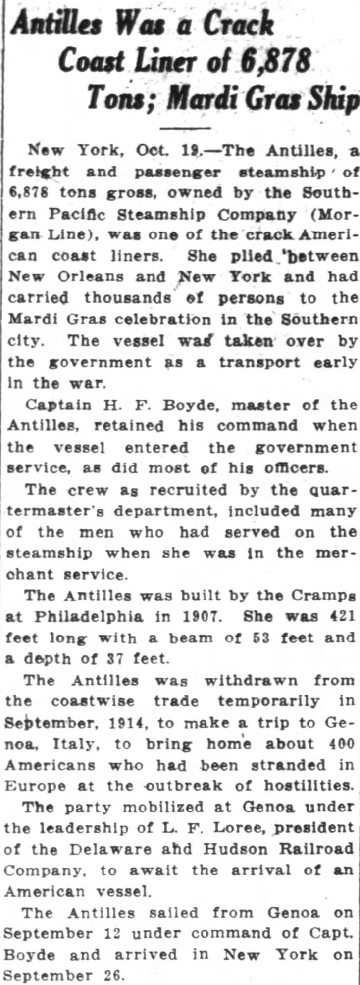 The Antilles was a freight and passenger ship of 6,878 tons and was owned by the Southern Pacific Steamship company. Until taken over by the United States government early in the war she plied between New York and New Orleans.