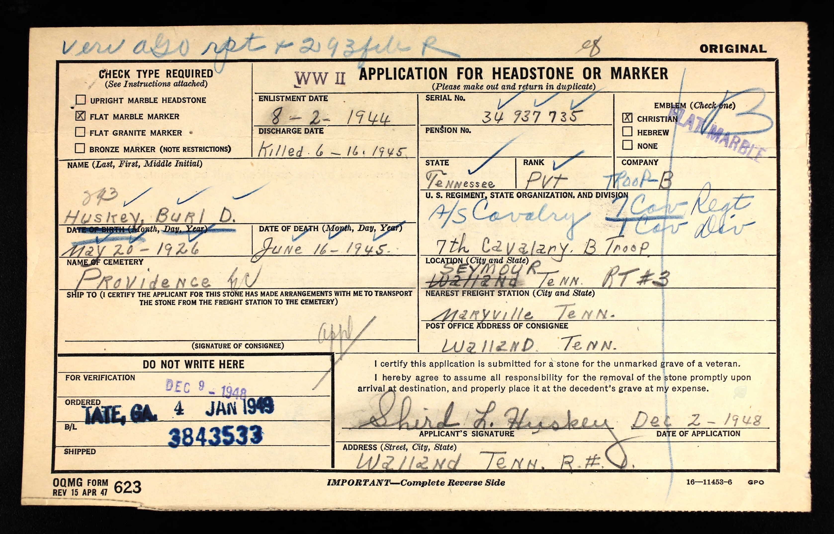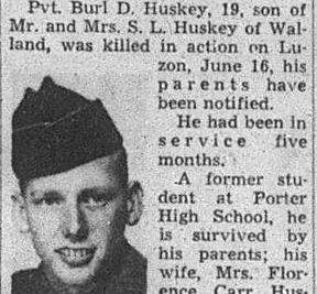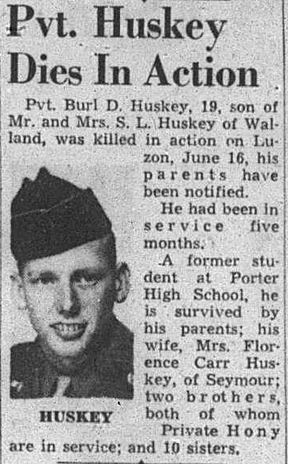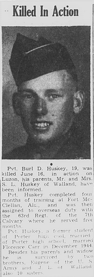 Pvt. Burl D. Huskey, 19, was killed June 16, in action on Luzon, his parents, Mr. and Mrs. S.L. Huskey of Walland, have been informed. Pvt. Huskey completed four months of training at Fort McClellan, Ala., and was then assigned to overseas duty with the 63rd Regt. Of the 7th Calvary where he served five months. Pvt. Huskey, a former student of Porter High School, married Florence Carr in December, 1944. Besides his parents and widow, he is survived by two brothers, Eugenen of the U.S. Army and J.L. of Walland, also 10 sisters.
