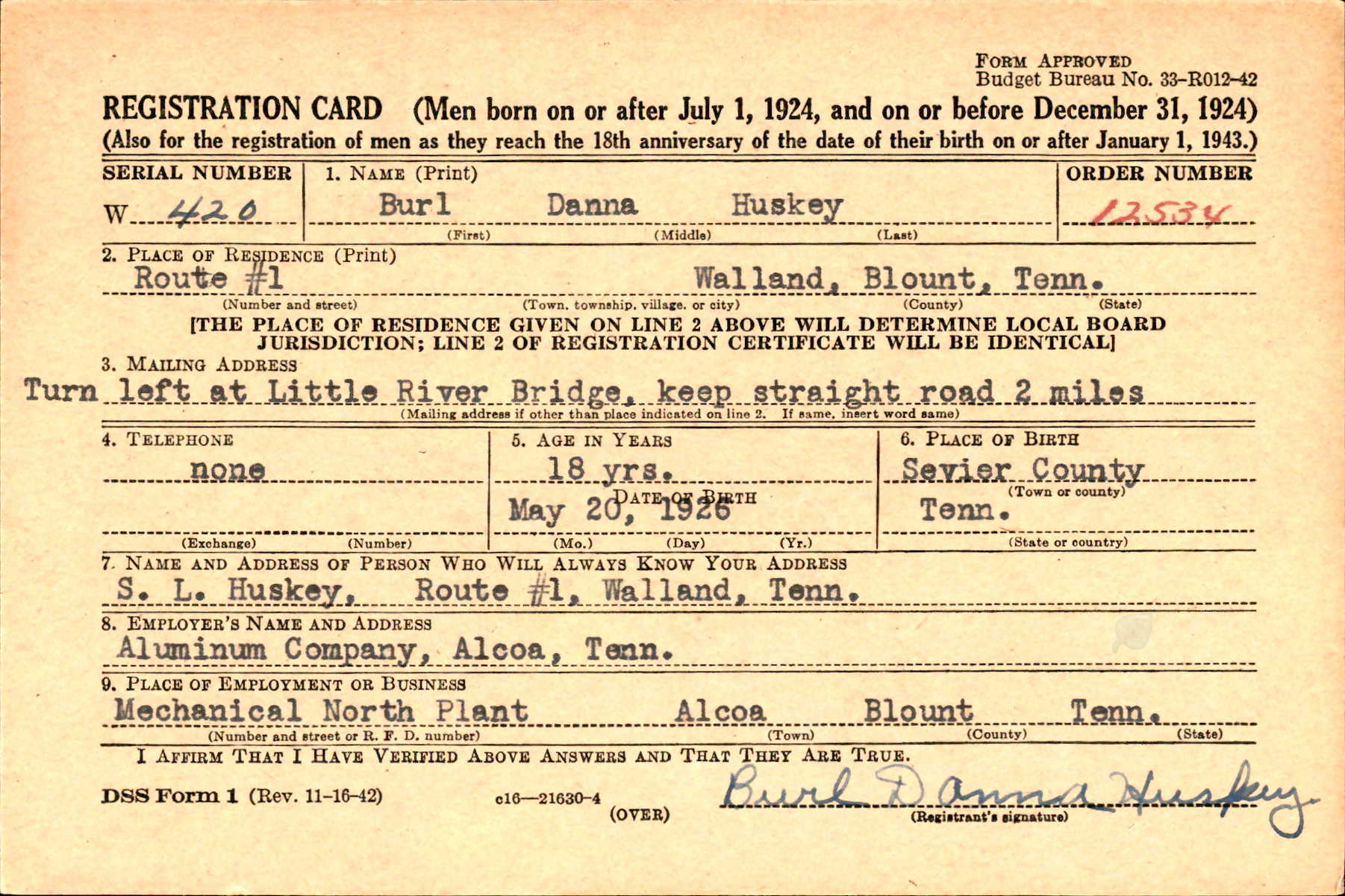 Burl Danna Huskey was born in Sevier County, Tennessee, the son of Shird Luther Huskey and Emma Rebecca Trentham. Husband of Florence Carr.
