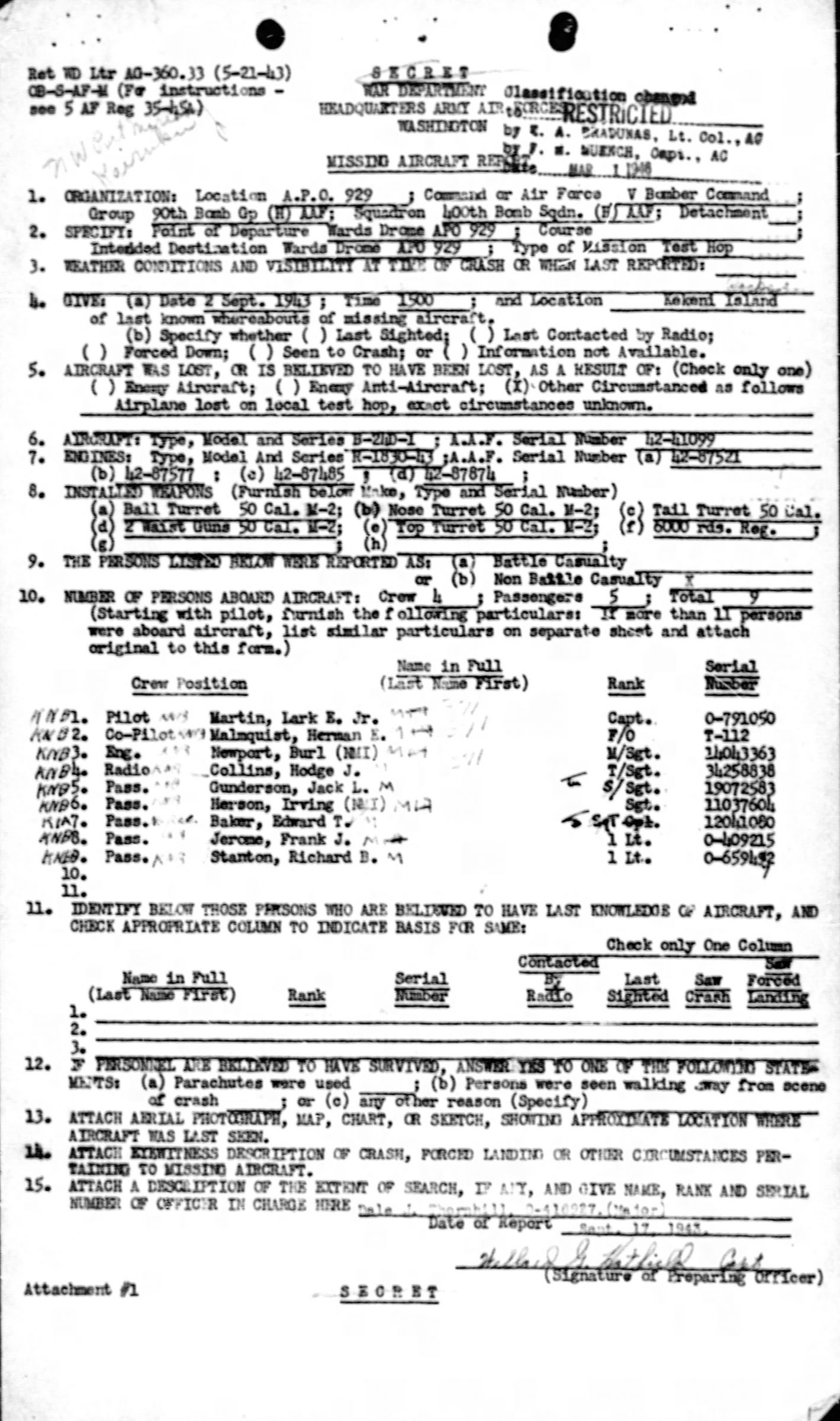 All Crew members are still missing and commemorated on the Tablets of the Missing at Manila American Cemetery, Fort Bonifacio, Manila, Philippines.