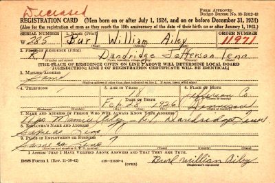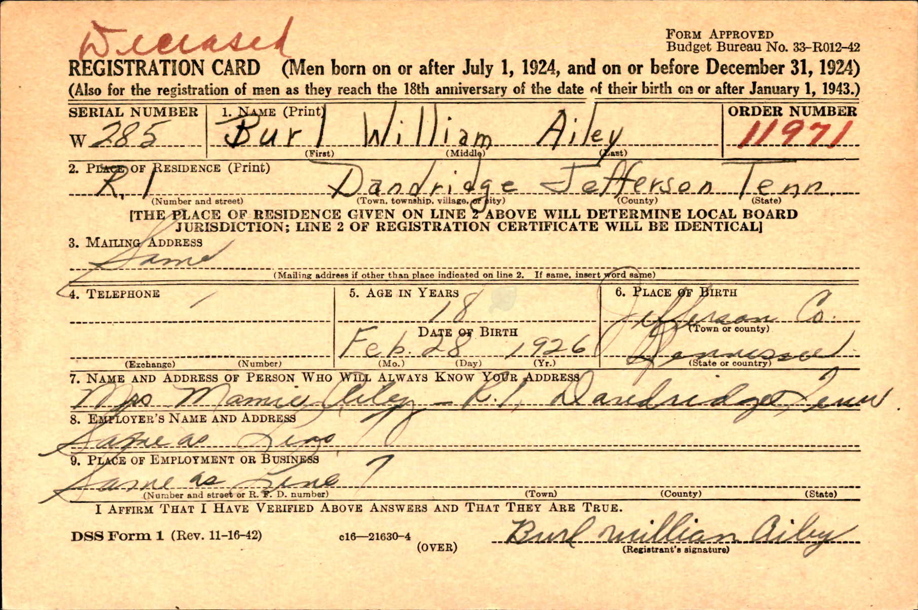 Burl William Ailey was the son of James Fletcher Ailey and Mamie Lou Collette. He never married.