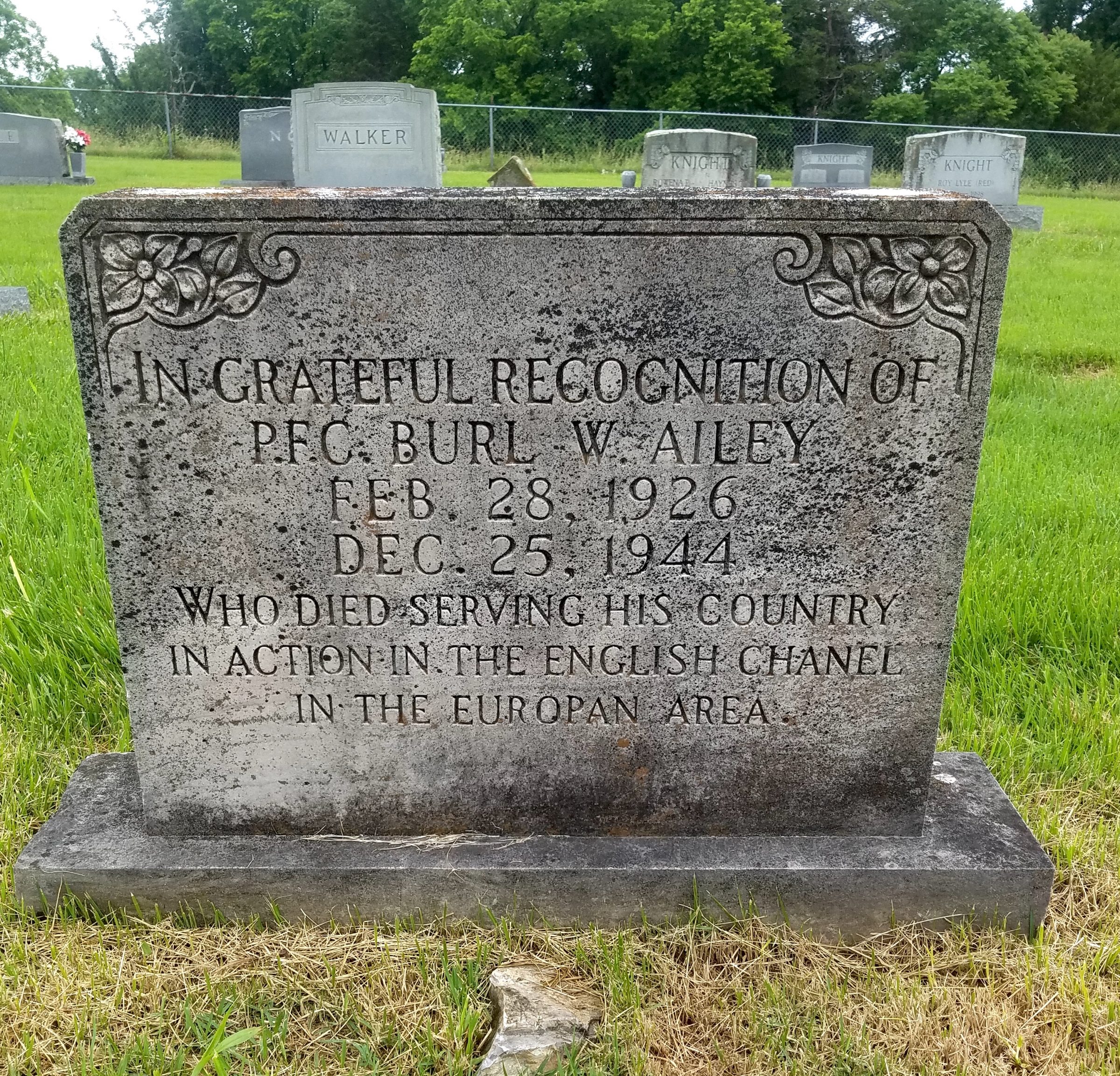 Private Burl W. Ailey was assigned to the 262nd Infantry Regiment, 66th Division. The 66th Division was being transported from England to Cherbourg, France on 24 December 1944. Half of the Division was on board the SS Leopoldville, a Belgian passenger ship that had been converted to a troop transport. With Cherbourg in sight the Leopoldville was struck by a torpedo. 14 officers and 784 enlisted men were killed, the second largest loss from a troop ship sinking. Private Ailey was declared dead on 25 December 1944, and is listed on the Tablets of the Missing, Normandy American Cemetery, Colleville-sur-mer, France.