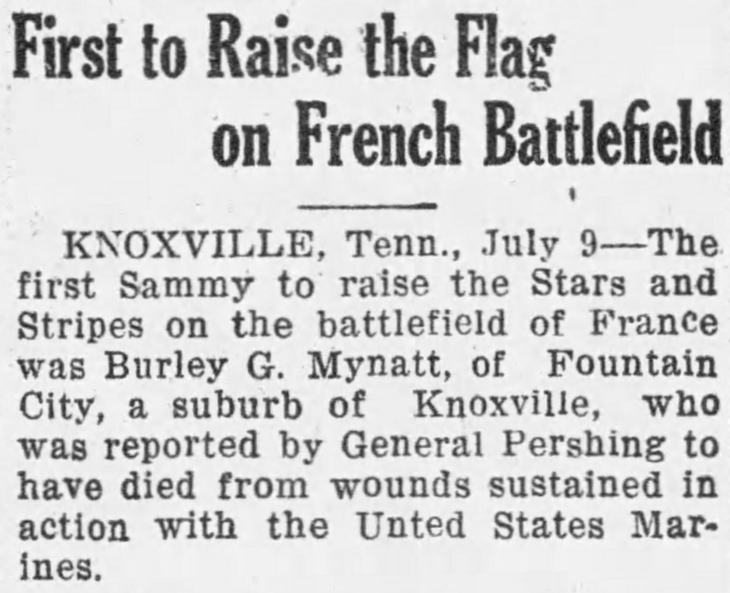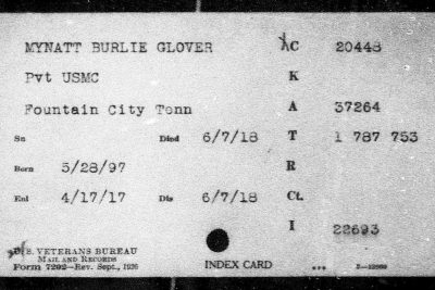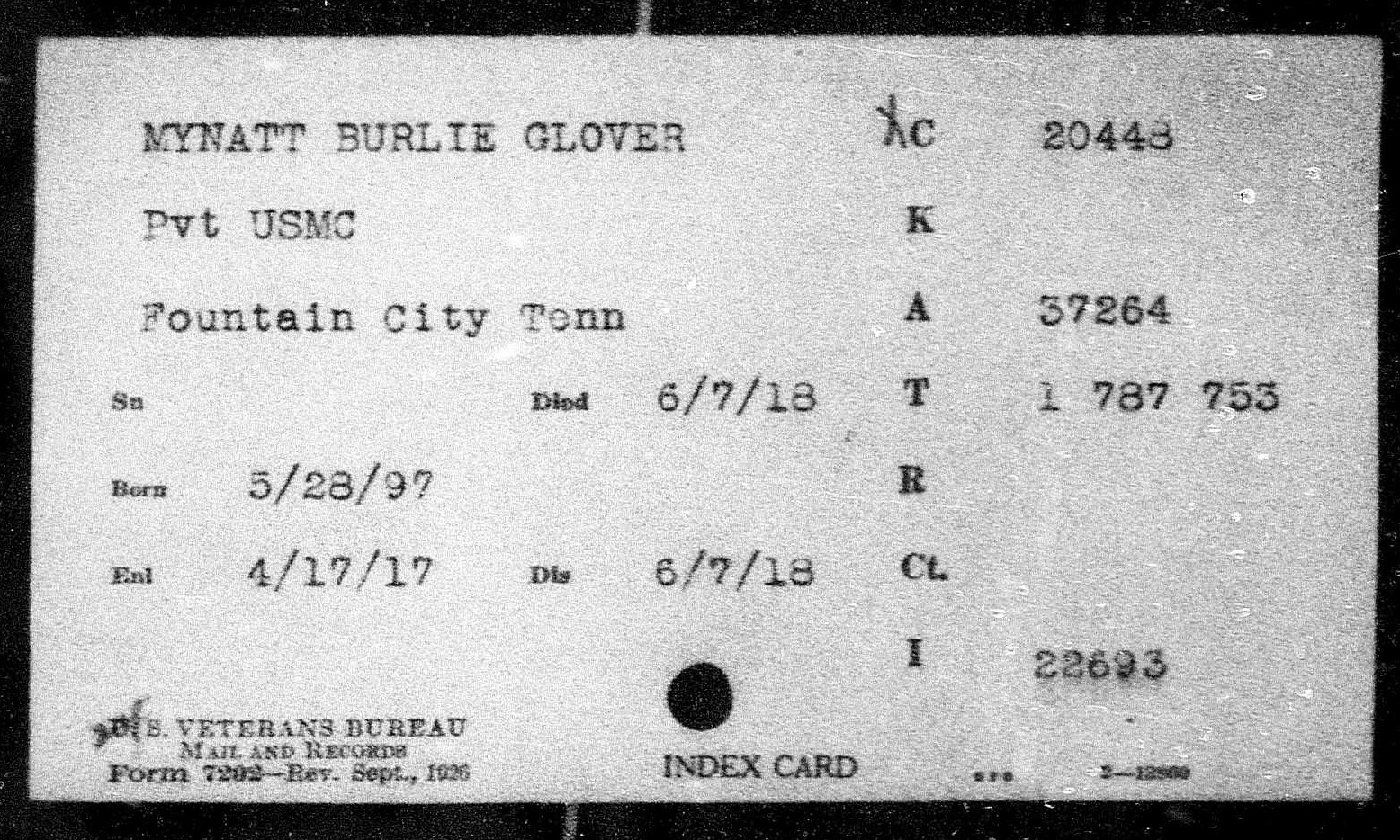 Burlie Glover Mynatt began his military career June 11, 1917, as a member of the 47th Company, 5th Regiment of Marines, stationed at Port Royal, SC, for training. Private Mynatt was severely wounded June 7, 1918, which resulted in his death. His division was engaged in holding the Marne sector against the Germans.