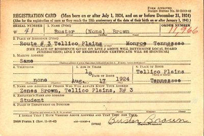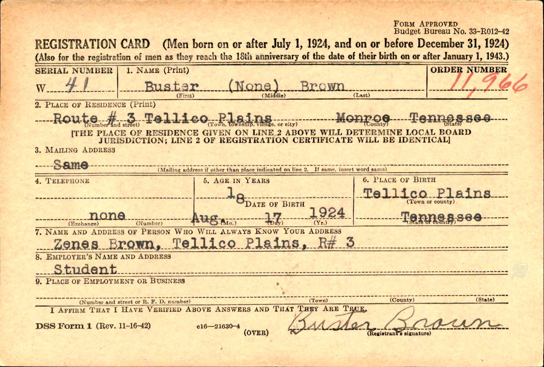 He enlisted with the US Army on July 13, 1943 at Fort Oglethorpe, Georgia. Buster had attended high school up to his junior year and was not married at the time of his enlistment.
