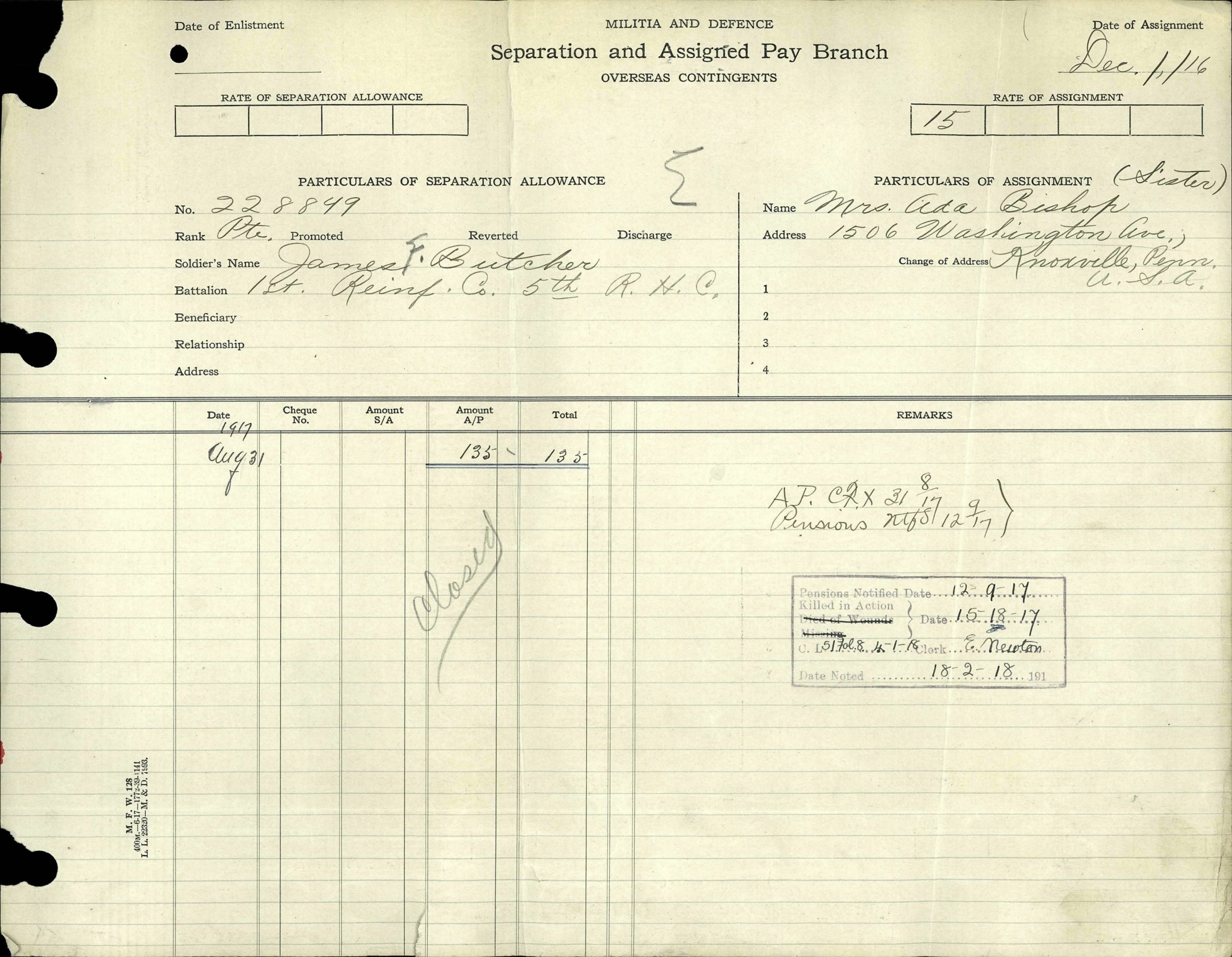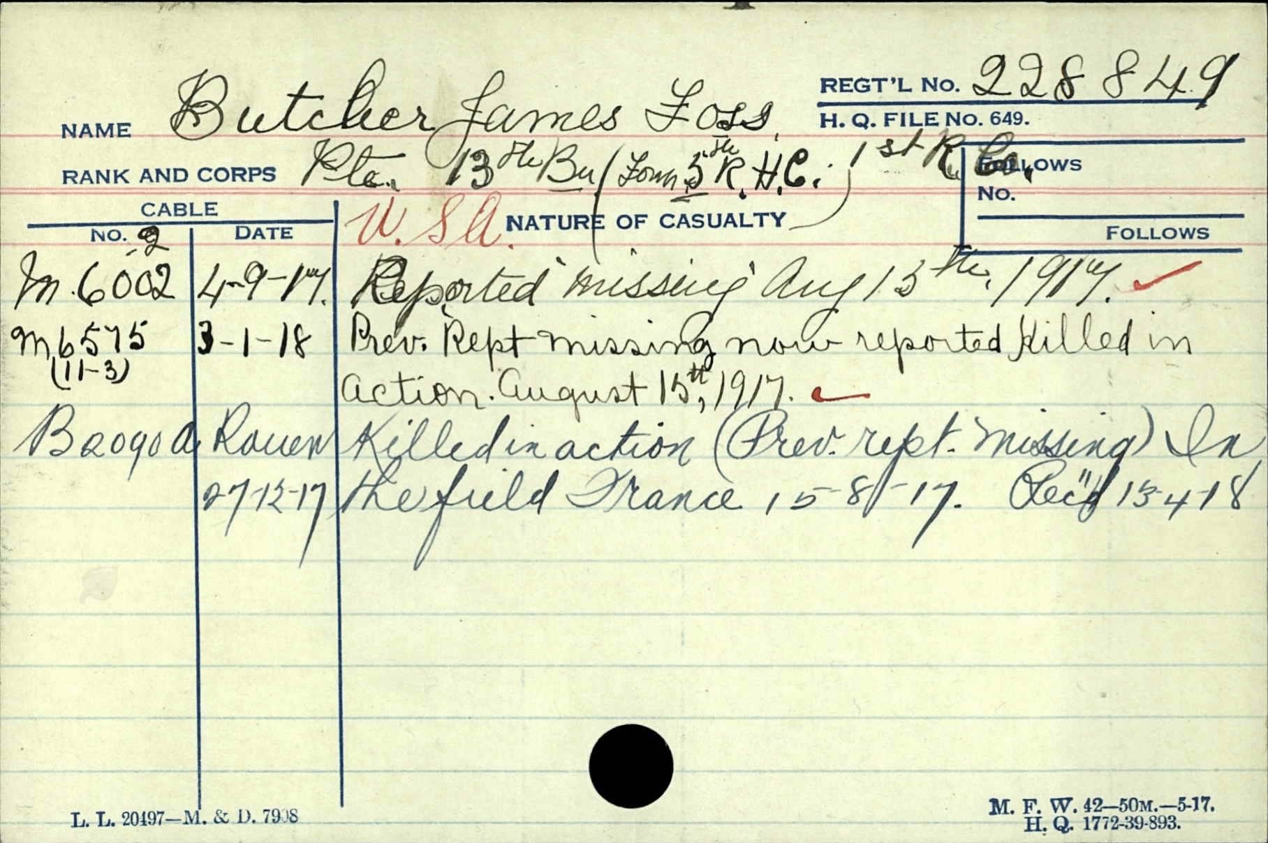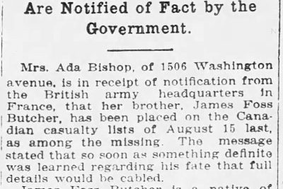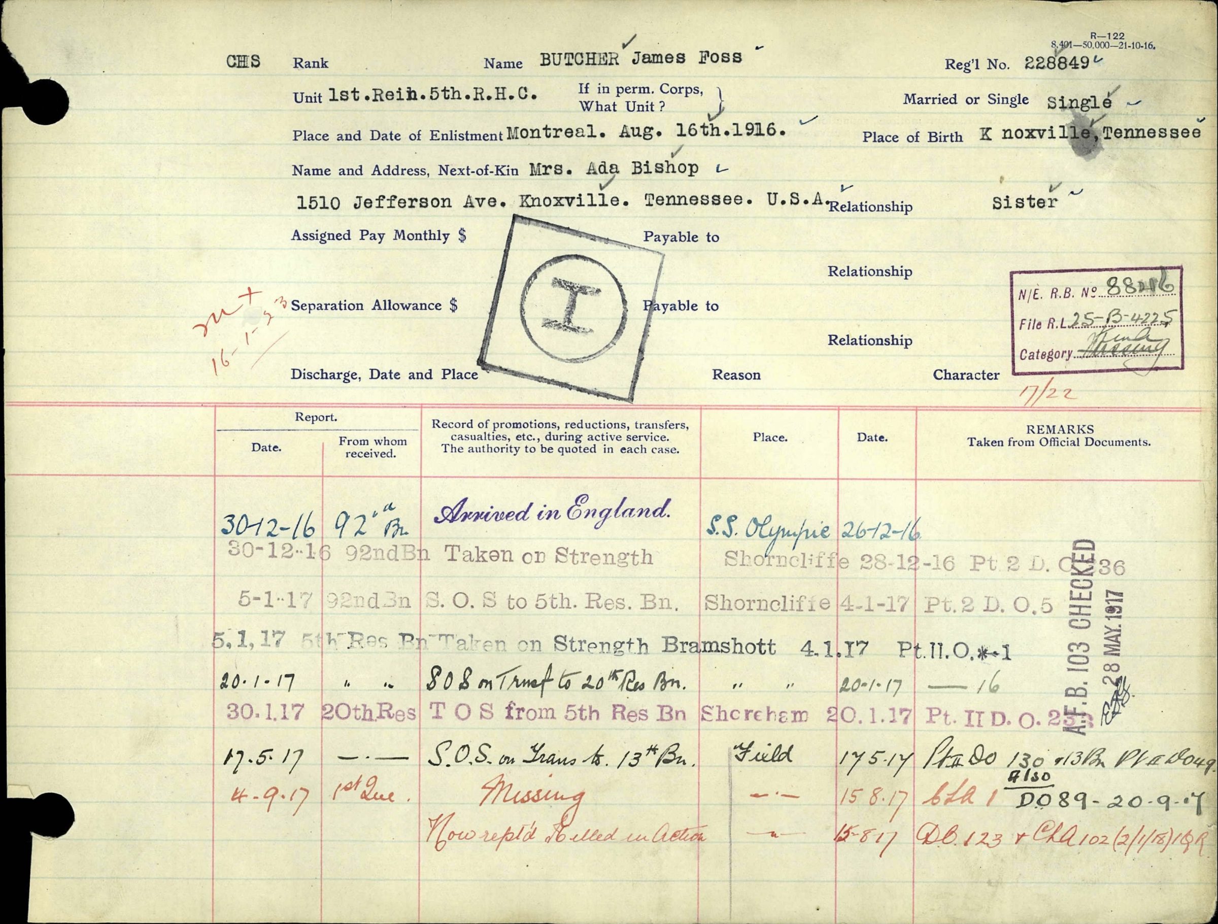He was killed on August 15, 1917 in the field in France and is memorialized on the walls of the missing at the Vimy Memorial in the Département du Pas-de-Calais, Nord-Pas-de-Calais, France.