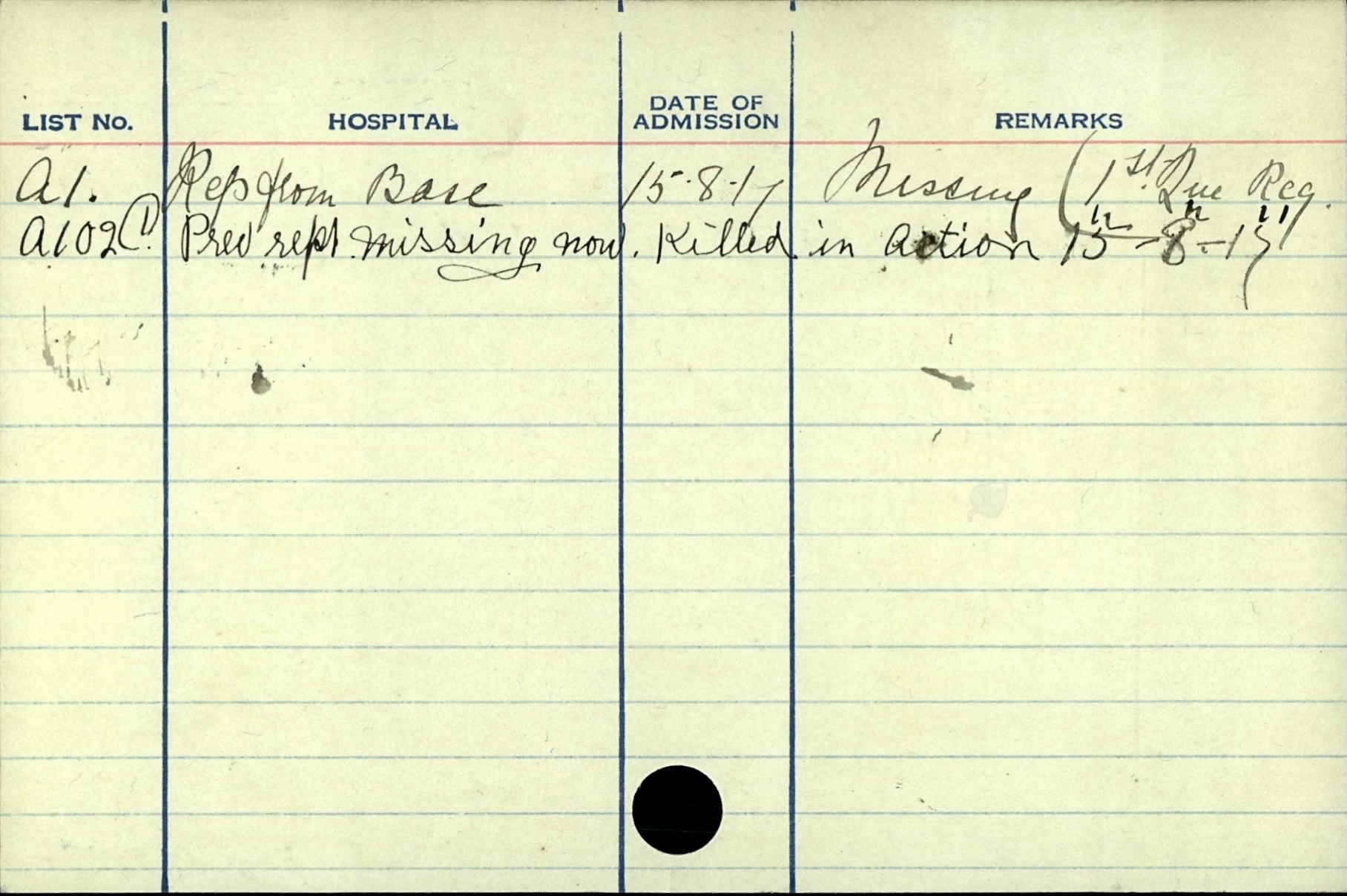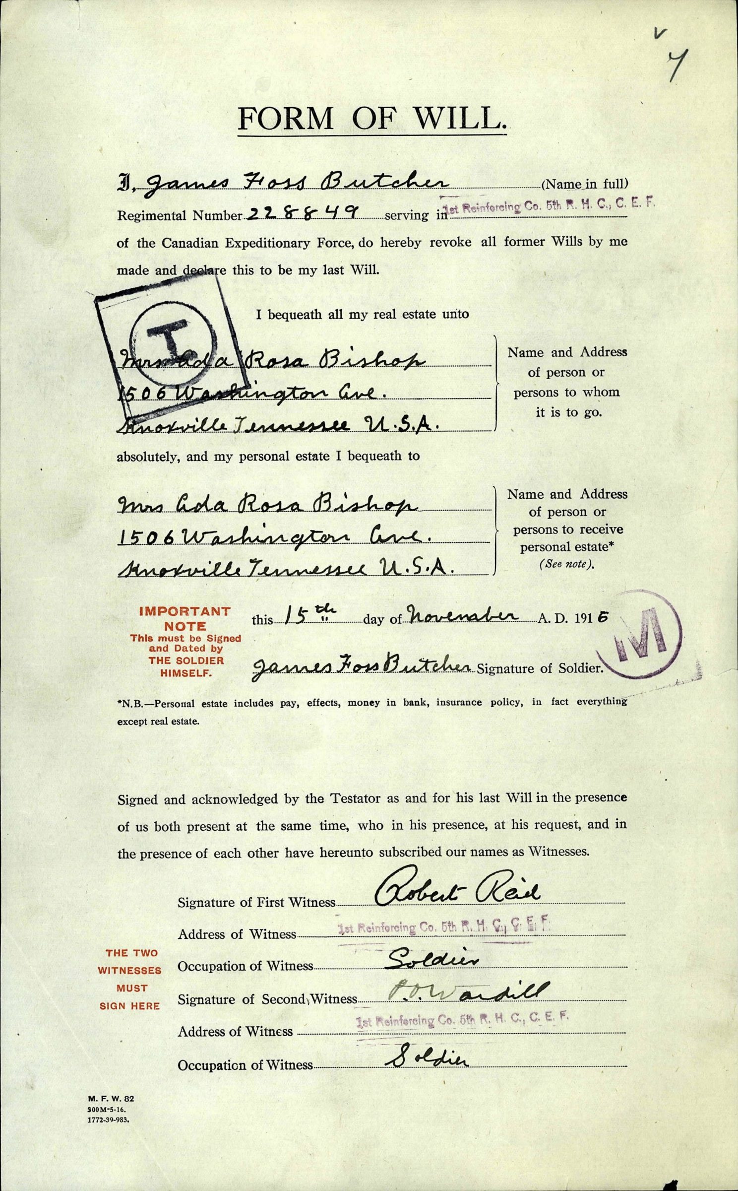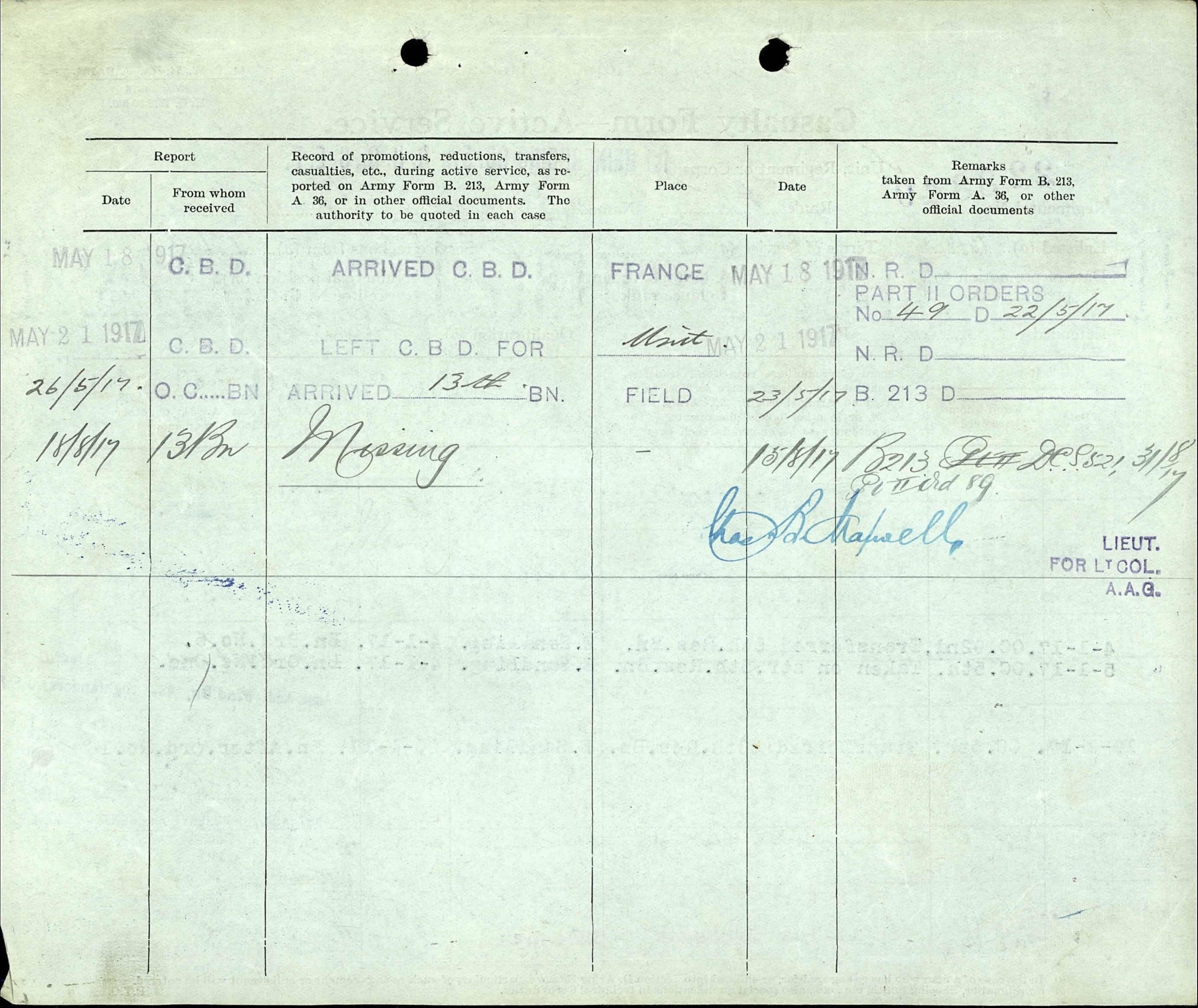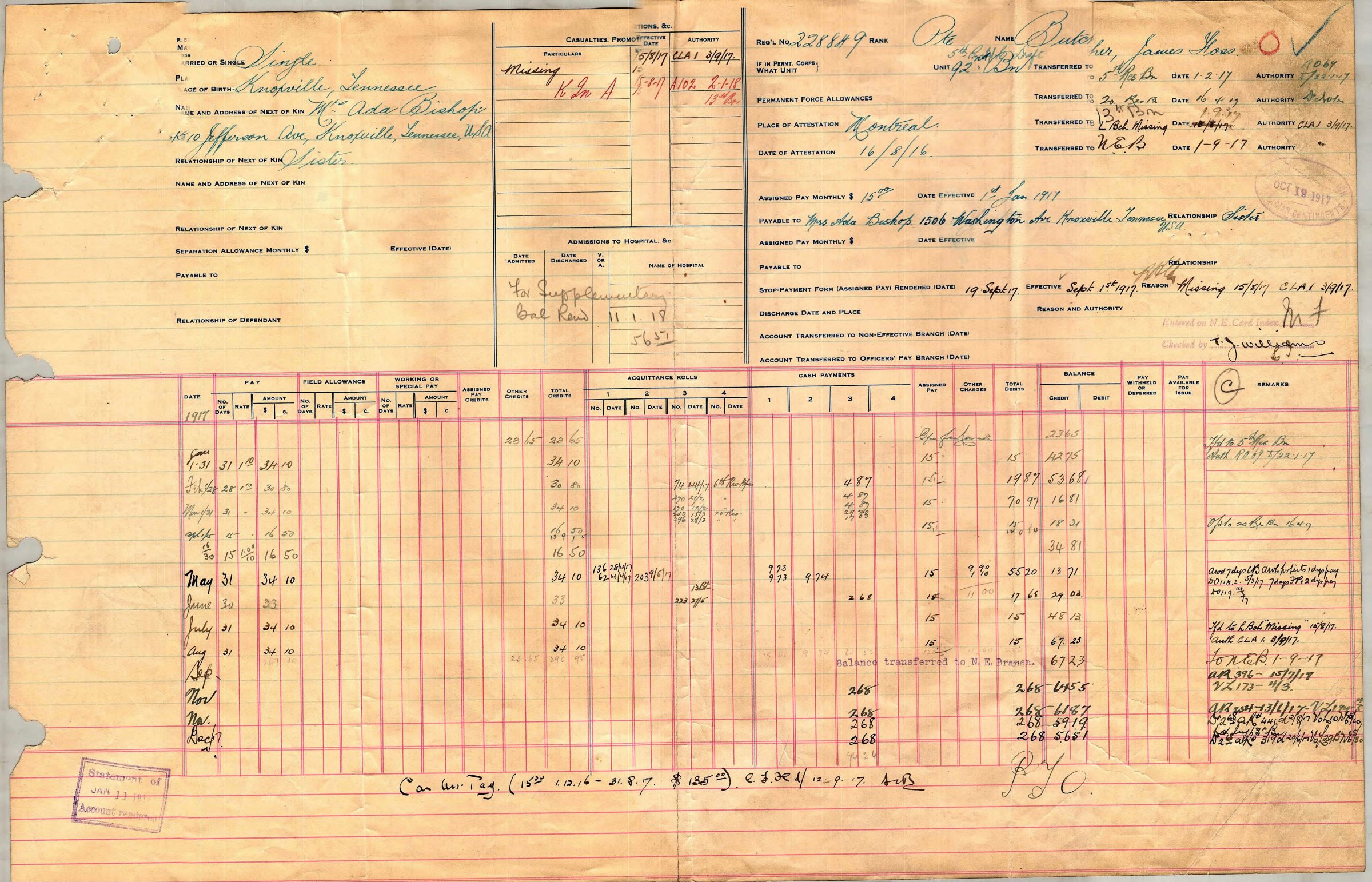 He was killed on August 15, 1917 in the field in France and is memorialized on the walls of the missing at the Vimy Memorial in the Département du Pas-de-Calais, Nord-Pas-de-Calais, France.