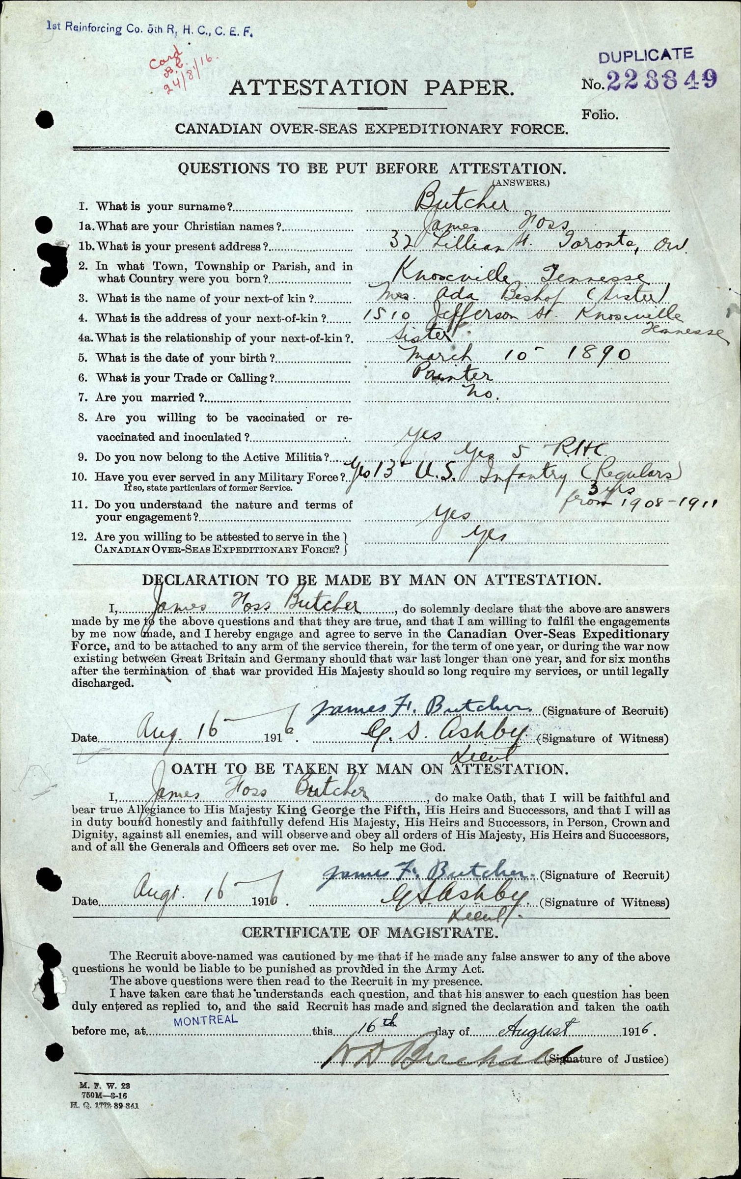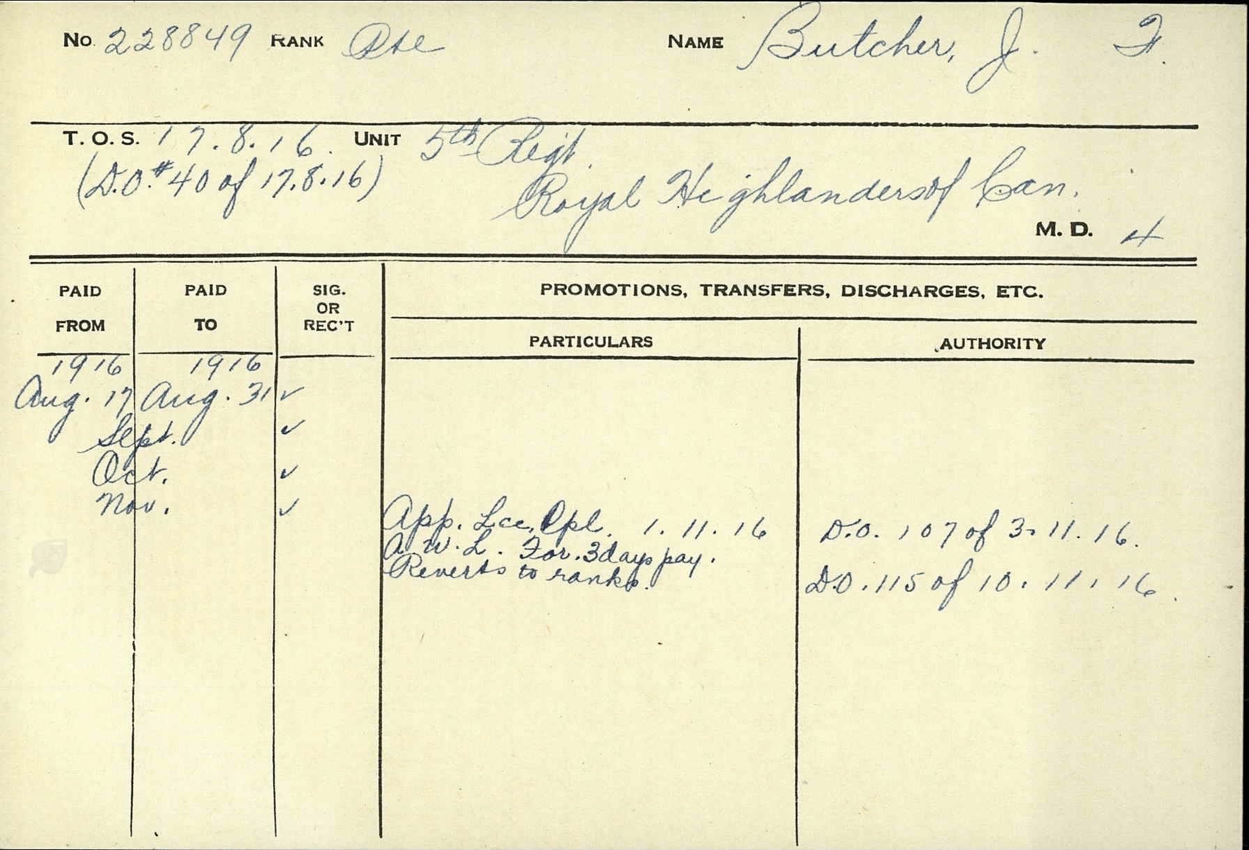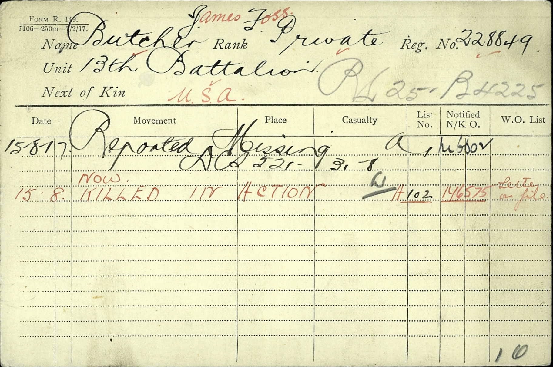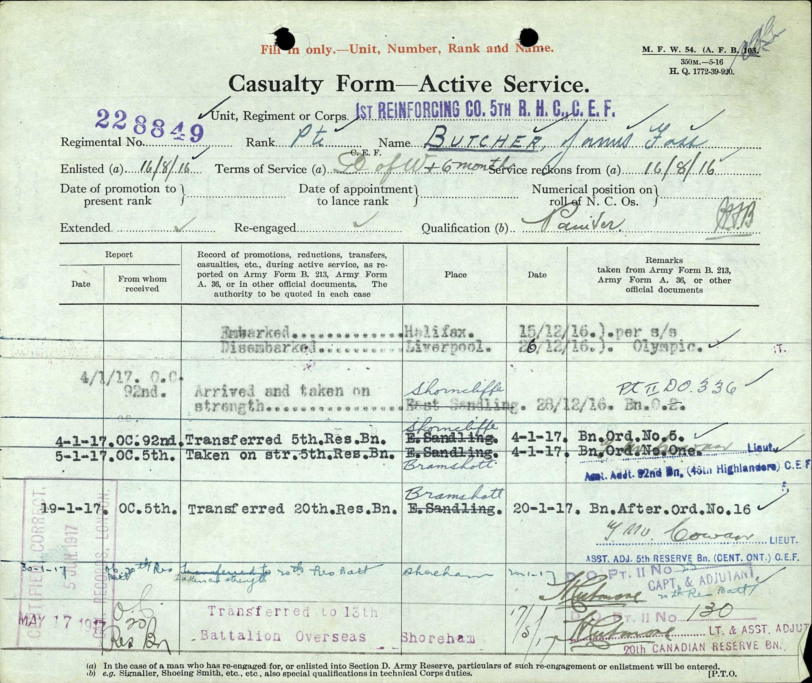 His serialnumber with the Canadian Forces was 228849. He joined the Canadian Overseas Expeditionary Force on August 16, 1916. He was a Private at the time of his death and served with the 13th Battalion Canadian Infantry (Quebec Regiment).