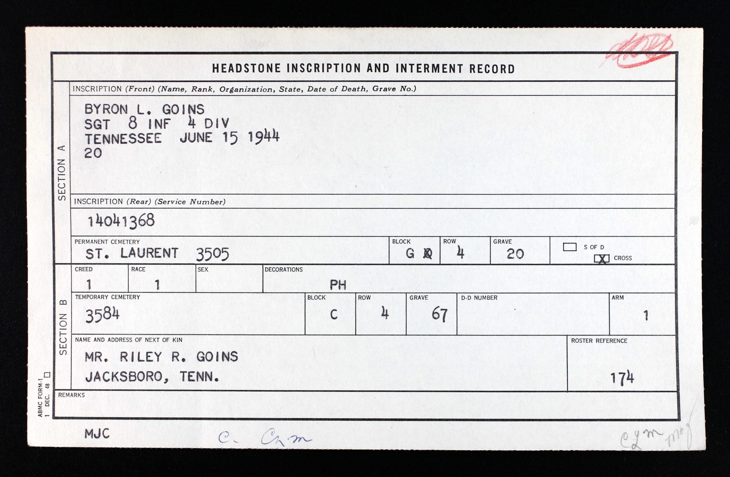 Sergeant Byron L. Goins #14041368 US Army was assigned to the 8th Infantry Regiment, 4th Infantry Division. The 8th Regiment went ashore on 6th of June 1944 across Utah Beach led by Gen Teddy Rosevelt Jr. The Division moved inland to support and reinforce the 82nd and 101st Airborne units. It then began the offensive to take the Cotentin Peninsula.