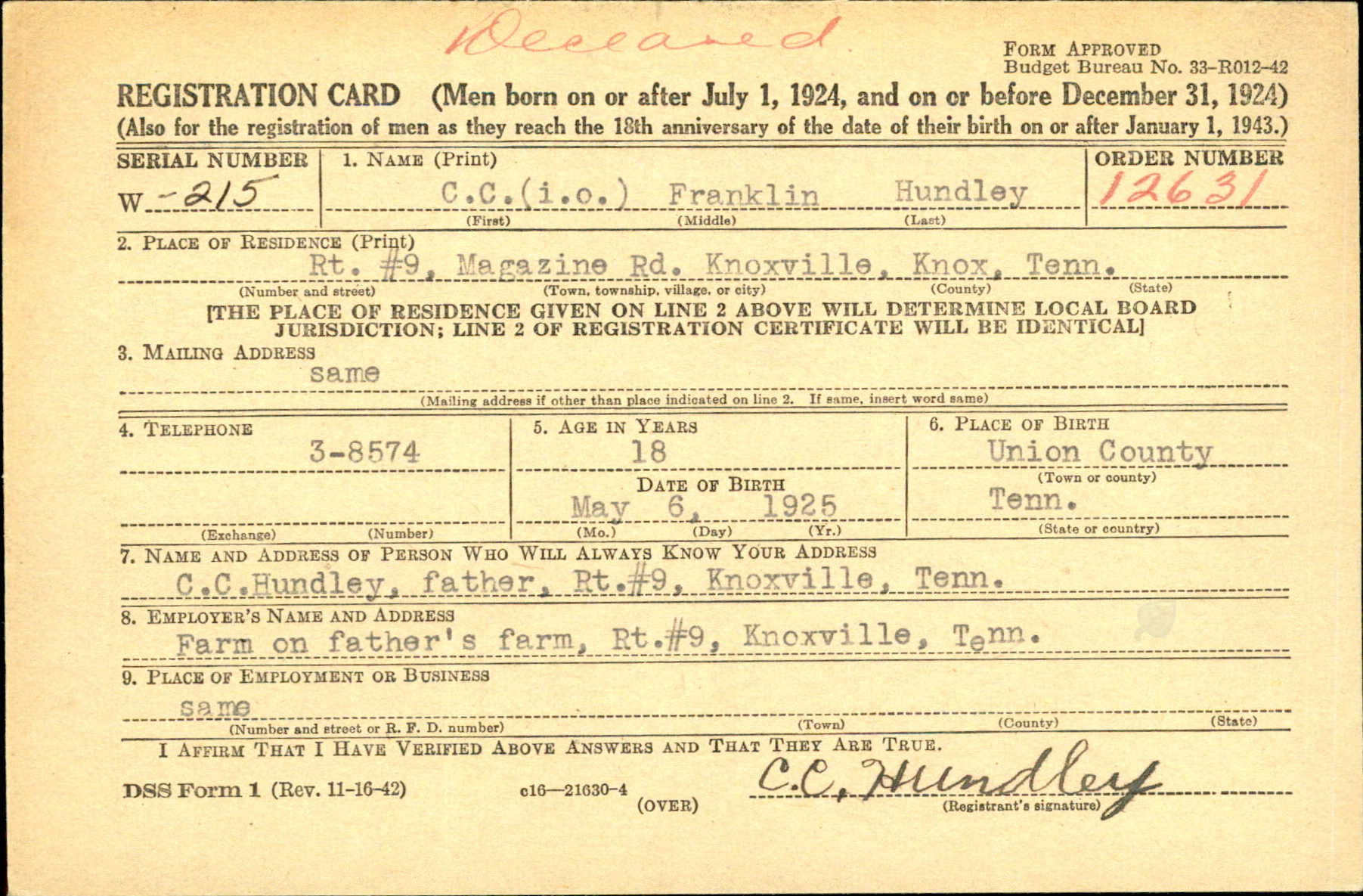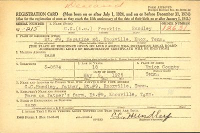 C.C. Franklin Hundley was born in Union County, Tennessee, the son of Cleradon C. Hundley and Laura Seymour. He was the brother of Lissie Hundley and Madaline Hundley. He was married to Glady Ward and father of Rebecca Ann Hundley. He enlisted on September 21, 1943, in Fort Oglethorpe, GA. Private Hundley was killed in Italy.