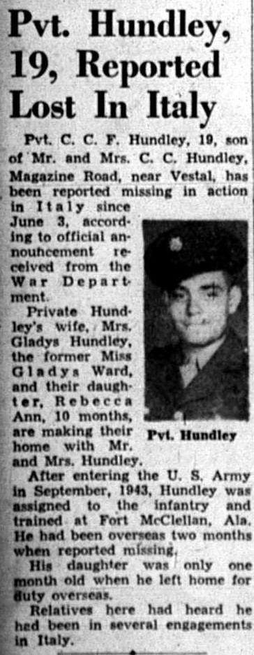 Pvt. C.C.F. Hundley, 19, son of Mr. and Mrs. C.C. Hundley, Magazine Road, near Vestal, has been reported missing in action in Italy since June 3, according to official announcement received from the War Department. Private Hundley’s wife, Mrs. Gladys Hundley, the former Miss Gladys Ward, and their daughter, Rebecca Ann, 10 months, are makingtheir home with Mr. and Mrs. Hundley.