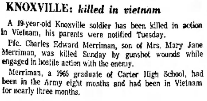Merriman, a 1966 graduate of Carter High School, had been in the Army eight monts and had been in Vietnam for nearly three months.