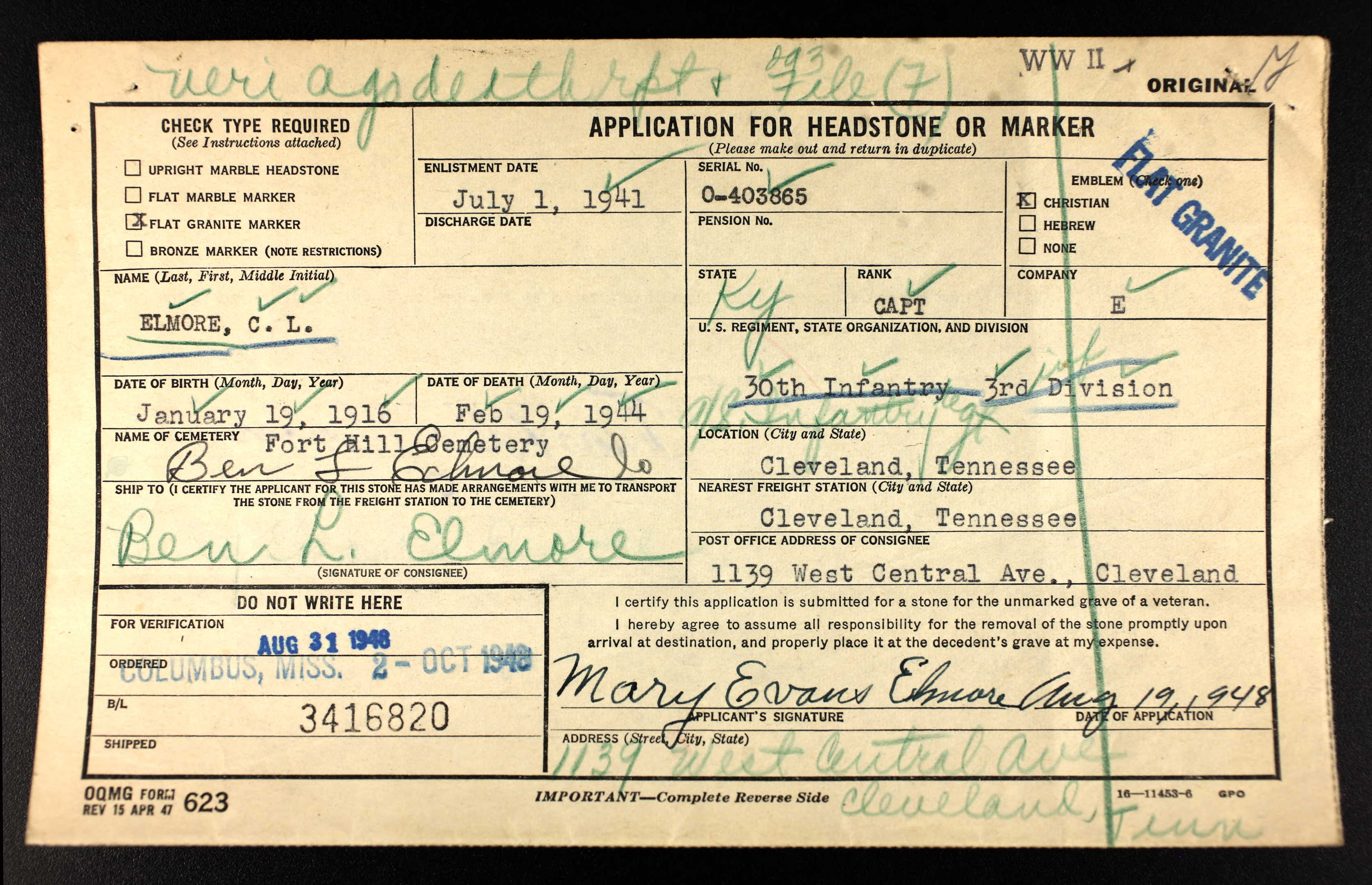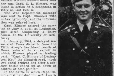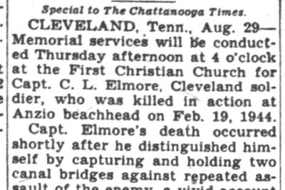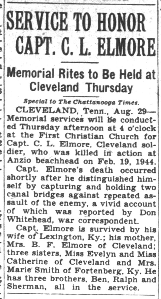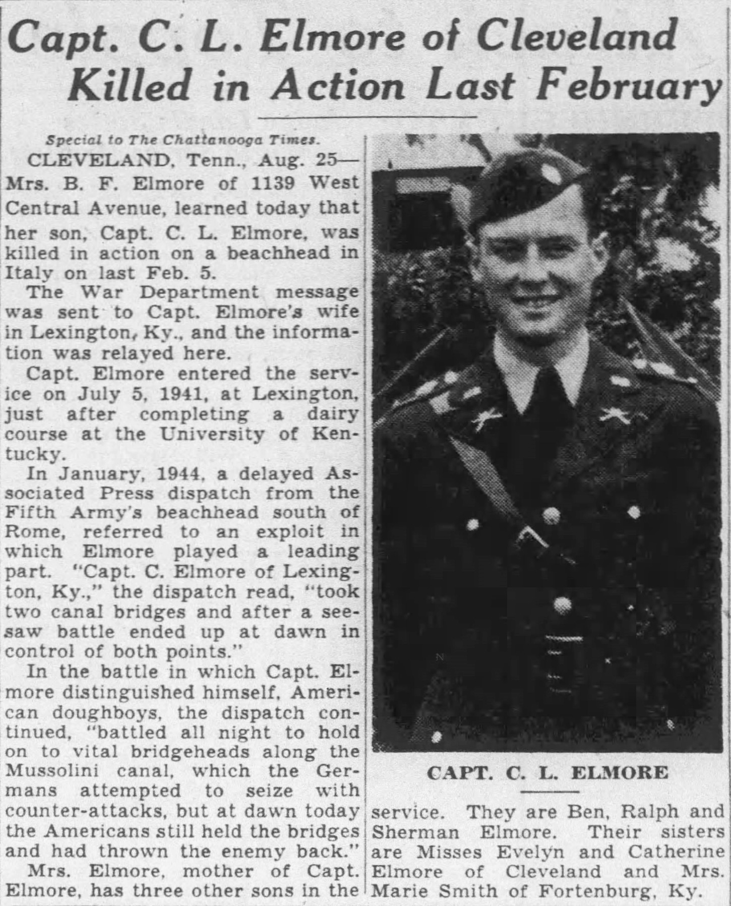 Mrs. B.F. Elmore of 1139 West Central Avenue, learned today that her son, Capt. C.L. Elmore, was killed in action on a beachhead in Italy on last Feb. 5. The War Department message was sent to Capt. Elmore’swife in Lexington, Ky., and the information was relayed here. Capt. Elmore entered the service on July 5, 1941, at Lexington, just after completing a dairy course at the University of Kentucky. In January, 1944, a delayed Associated Press dispatch from the Fifth Army’s beachhead south of Rome, referred to an exploit in which Elmore played a leading part. “Capt. C. Elmore of Lexington, Ky.” The dispatch read, “took two canal bridges and after a seesaw battle ended up at dawn in control of both points.” In the battle in which Capt. Elmore distinguished himself, American doughboys, the dispatchh continued, “Battled all night to hold on to vital bridgeheads along the Mussolinin canal, which the Germans attempted to seize with counter-attacks, but at dawn today the American still held the bridges and had thrown the enemy back.”