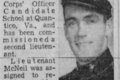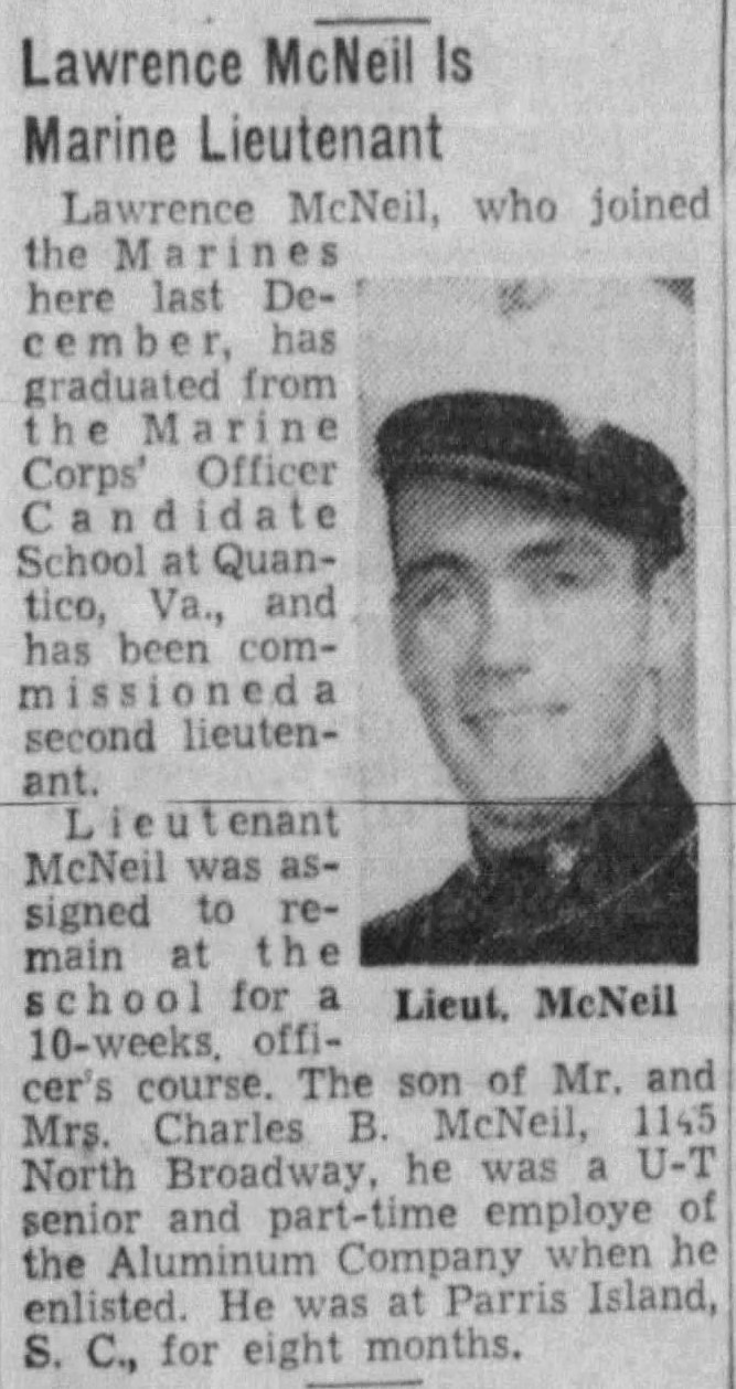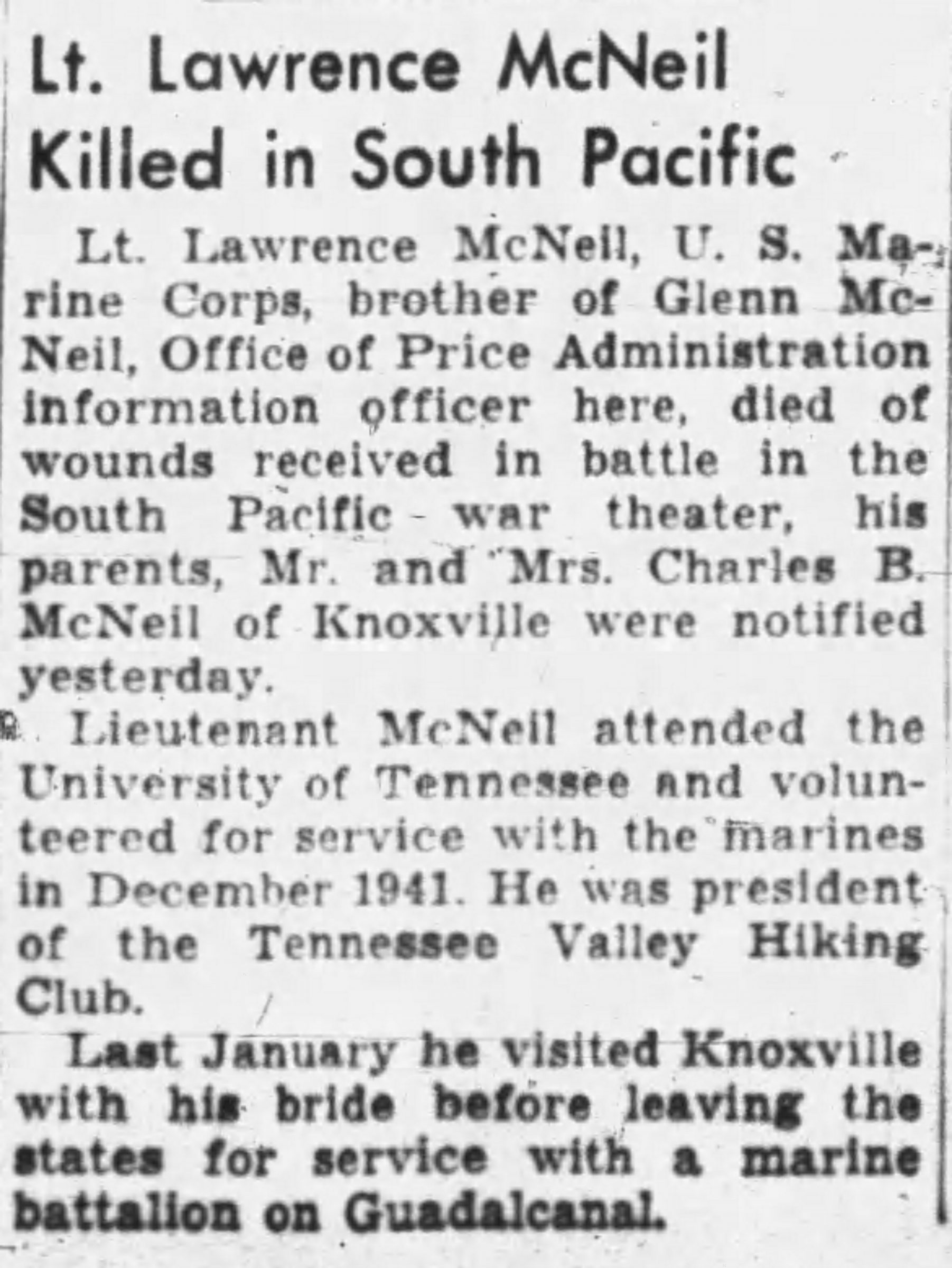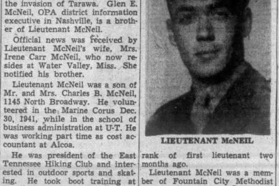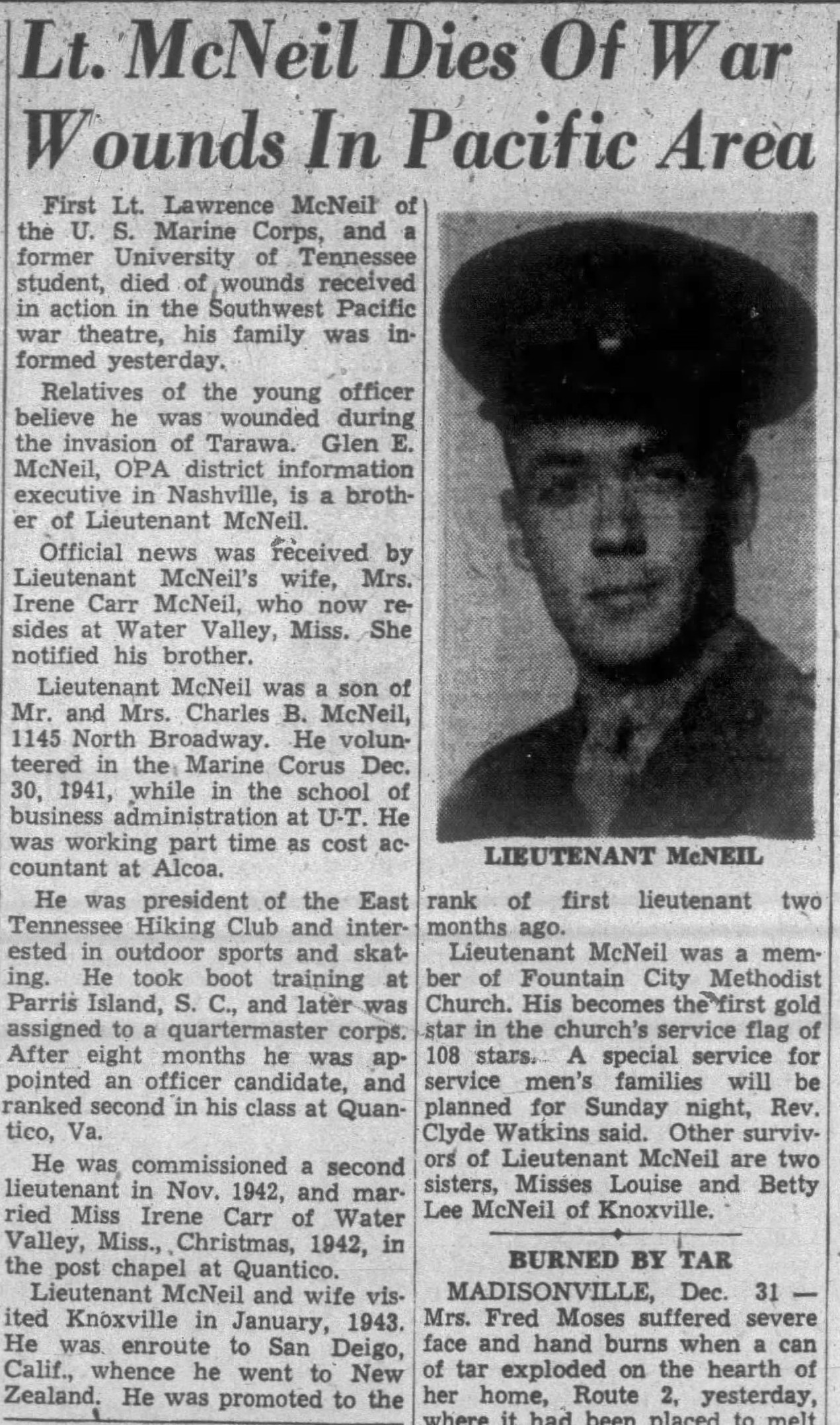 First Lt. Lawrence McNeil of the U.S. Marine Corps, and a former University of Tennessee student, died of wounds received in action in the Southwest Pacific war theatre, his family was informed yesterday. Relatives of the young officer believe he was wounded during the invasion of Tarawa. Glen E. McNeil, OPA district information executive in Nashville, is a brother of Lieutenant McNeil. Official news was received by Lieutenant McNeil’s wife, Mrs. Irene Carr McNeil, who now resides at Water Valley, Miss. She notified his brother. Lieutenant McNeil was a son of Mr. and Mrs. Charles B. McNeil, 1145 North Broadway. He volunteered in the Marine Corus Dec. 30, 1941, while in the school of business administration at U-T. He was working part time as cost accountant in Alcoa. He was president of the East Tennessee Hiking Club and interested in outdoor sports and skating. He took boot training at Parris Island, S.C., and later was assigned to a quartermaster corps. After eight months he was appointed an officer candidate, and ranked second in his class at Quantico, Va. He was commissioned a second lieutenant in Nov. 1942, and married Miss Irene Carr of Water Valley, Miss., Christmas, 1942, in the post chapel at Quantico. Lieutenant McNeil and wife visited Knoxville in January, 1943. He was enroute to San Diego, Calif., whence he went to New Zealand. He was promoted to the rank of first lieutenant two months ago. Lieutenant McNeil was a member of Fountain City Methodist Church. His becomes the first gold star in the church’s service flag of 108 stars. Other survivors of Lieutenant McNeil are two sisters, Misses Louise and Betty Lee McNeil of Knoxville.