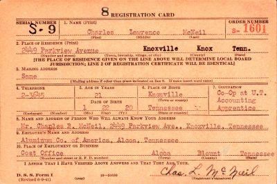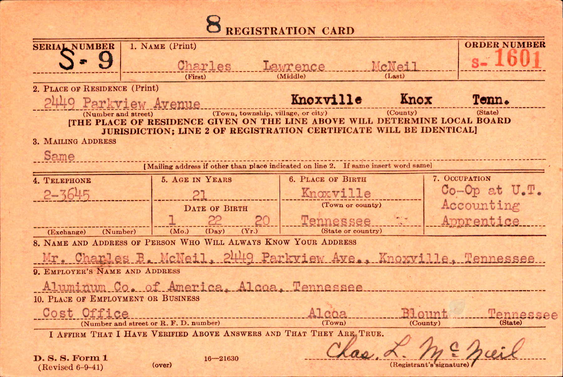Charles Lawrence McNeil was the son of Charles B. McNeil and Lillie Lee Steele. Charles was a graduate of Central High School, Knoxville, in 1937. He married Irene Cullings Carr at Brown Field in Virginia on 24 December 1942.