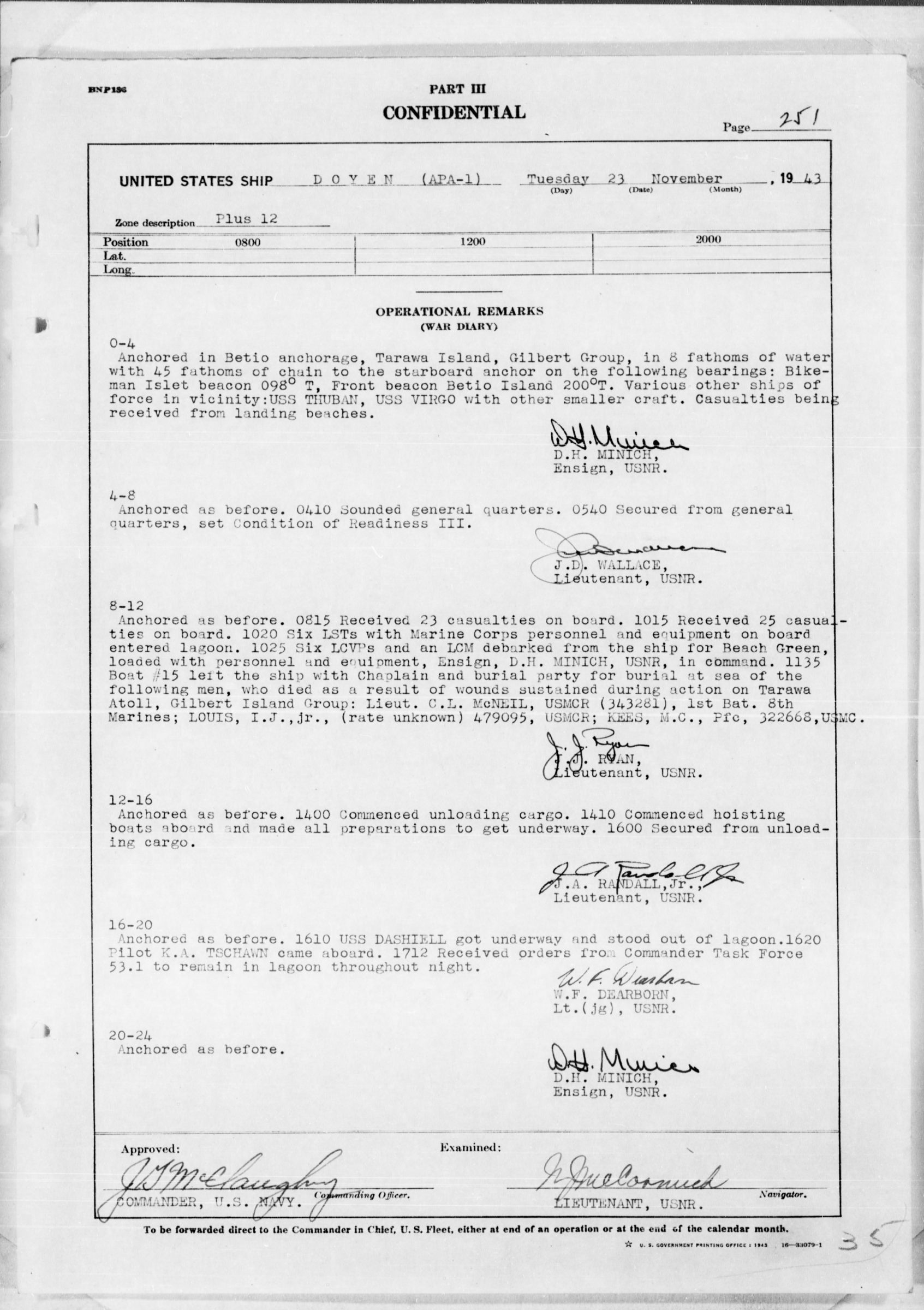 Killed in the Battle of Tarawa; Buried at sea from the USS Doyen.