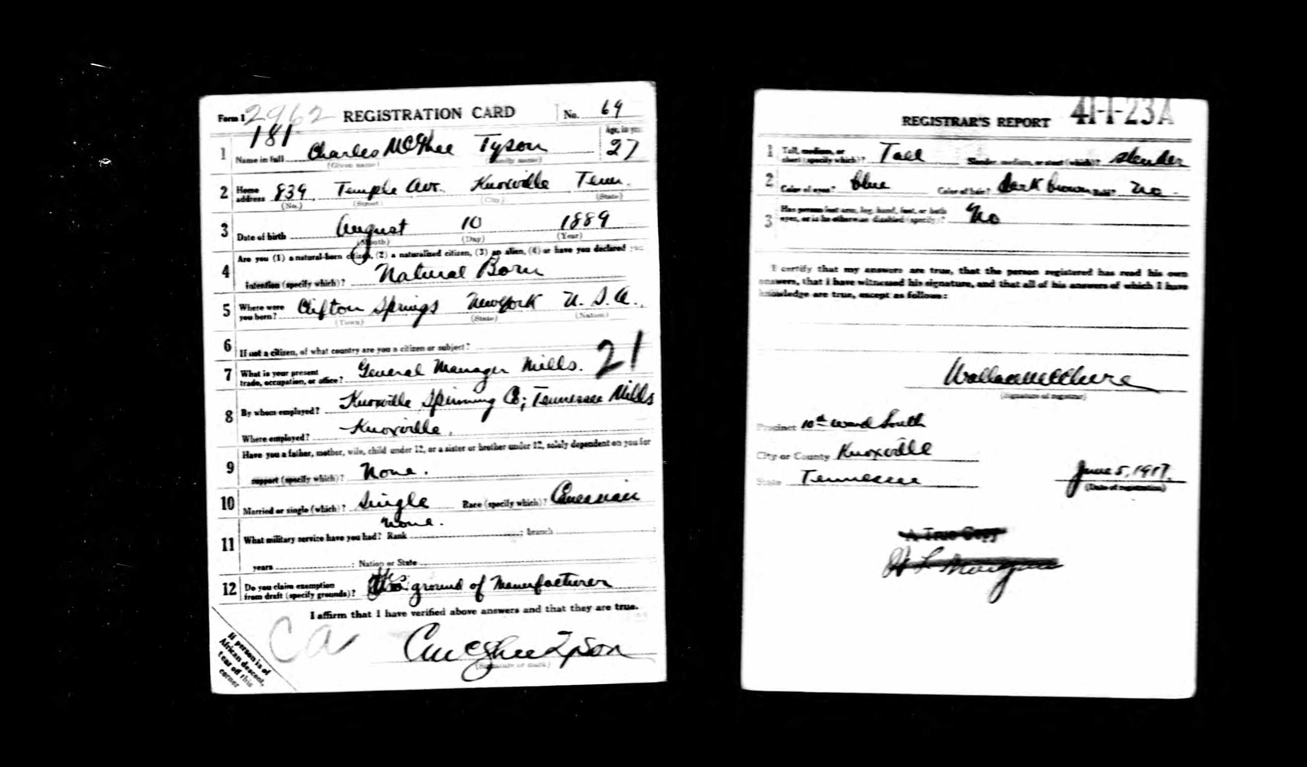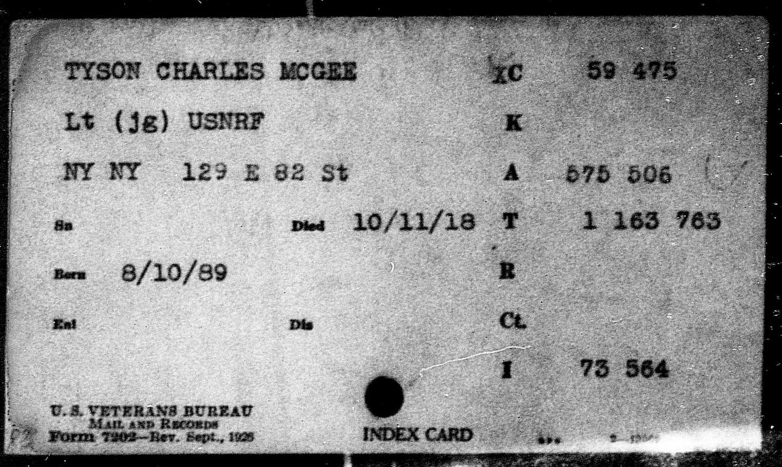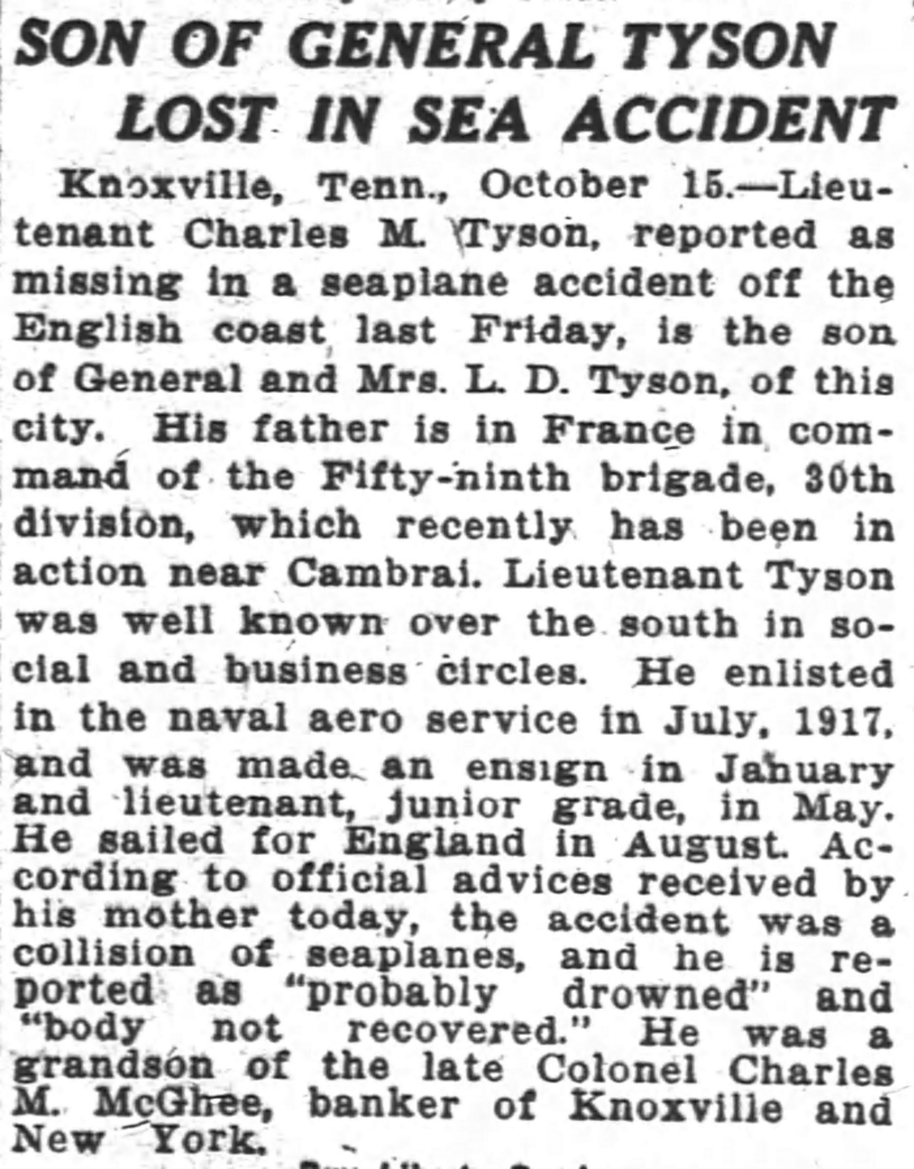 Charles McGhee Tyson enlisted in the service of his country as seaman, second-class, in July 1917, and rose to grade of lieutenant, junior grade, U.S. Naval Reserve Flying Corps, before his death October 11, 1918, while on a flight over the North Sea. Received his training at Massachusetts Institute of Technology, Pensacola, and Newport News. Because of executive ability, ordered to Washington and charged with ordering and loading supplies for the transport ship Jason. Requested to be allowed to join his flight squadron and sailed August 8, 1918. After his death his remains were brought to Knoxville under naval escort and buried with naval honors.