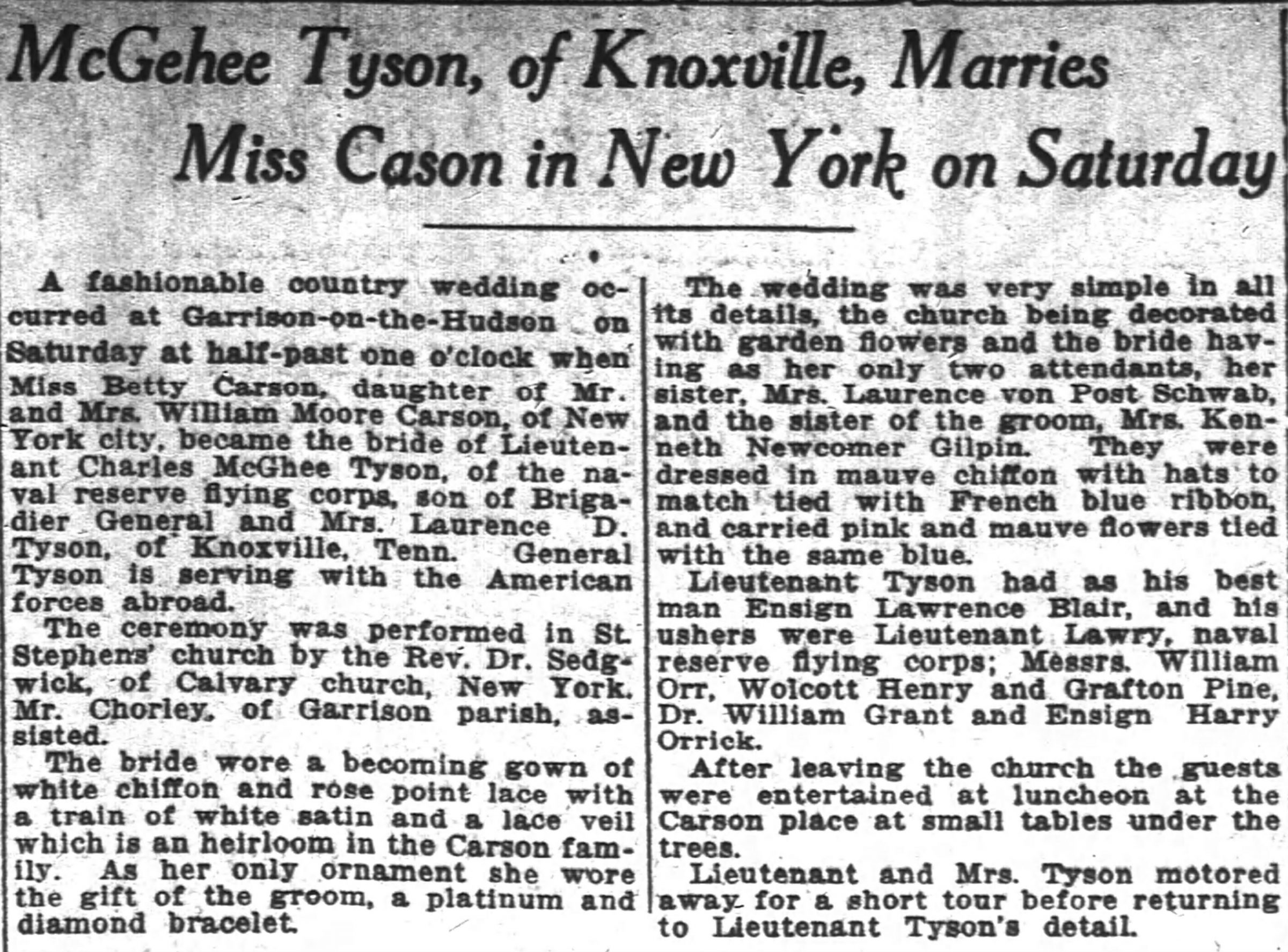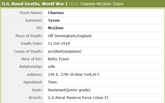 Tyson, born in 1889, grew up the son of Knoxville businessman Gen. Lawrence D. Tyson. He volunteered for duty with the Army Air Corps two months after marriage.