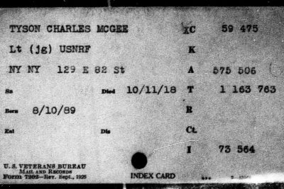 Charles McGhee Tyson was born 10 August 1889, Clifton Springs, New York to Lawrence Davis Tyson and Bettie Humes. He was married to Elizabeth Carson.