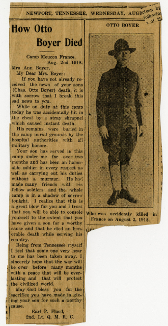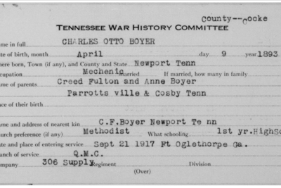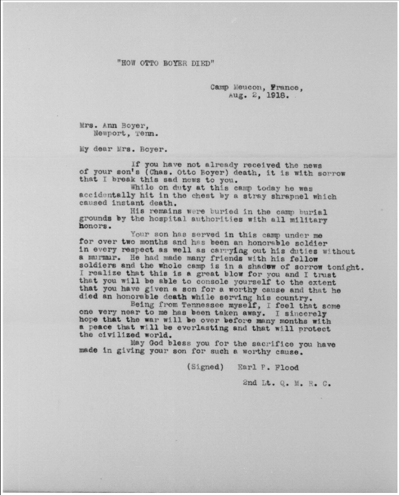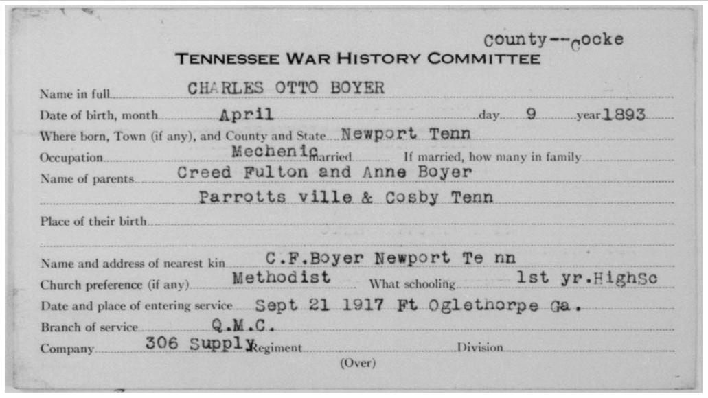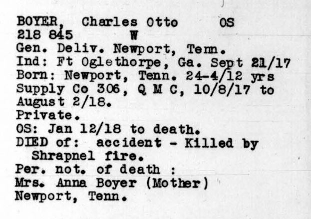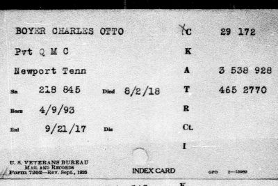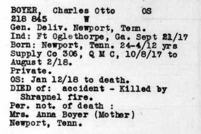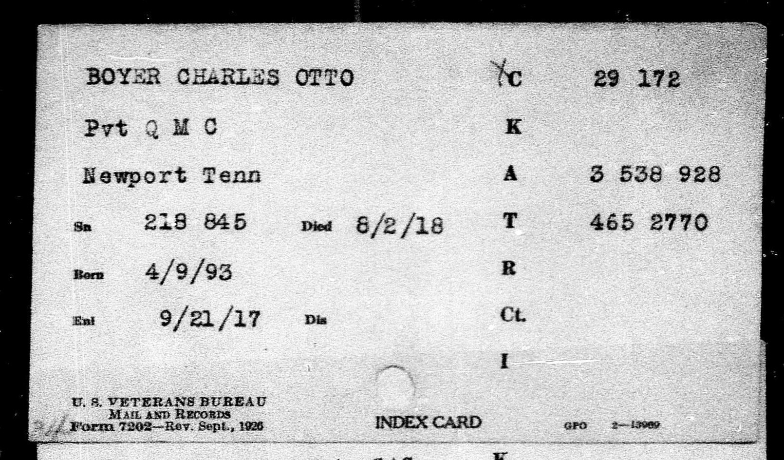 Charles Otto Boyer was born 9 April 1893, Newport, Tennessee to Creed Fulton and Anne Boyer. He entered the service on 21 September 1917 at Ford Oglethorpe in Atlanta, Georgia and received further training at Madison Barracks. He sailed to Europe on 8 January 1918, arriving on 25 January. He was driving a truck killed by shrapnel at Vannes in France on 2 August 1918. He is buried plot A row 25 grave 20, Oise-Aisne American Cemetery, Fère-en-Tardenois, France.